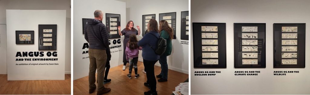 Angus Og made a special guest appearance at the Inverness Museum and Art Gallery this autumn as part of the Highland & Islands Climate Festival. The exhibition (pictured above) explored Ewen Bain’s relationship with environmental concerns, digging into how comics intersect with environmental issues and political inaction on climate change. Displaying Angus Og stories relating to the environment not only showcased how well-informed and forward-thinking their creator was, with some topics covered that were not regularly part of the mainstream narrative at the time, but also demonstrated the enduring topicality of many of the issues explored across the cartoon series. The exhibition was launched with a community workshop where we enjoyed seeing the work of some future cartoonists from the Inverness area and wrapped up with an evening of Angus Og discussion and entertainment from playwright Alan Bissett, Archivist Catherine MacPhee and Archive Project Officer Katharine MacFarlane. A huge thank you to the team at Inverness Museum and Art Gallery for hosting Angus Og and the team from the Skye and Lochalsh Archive Centre and to the people of Inverness who so warmly shared their memories of Angus Og and hopes for the future of the cartoon. Further information can be found at www.highlifehighland.com/skye-and-Lochalsh-archive-centre/angus-og/