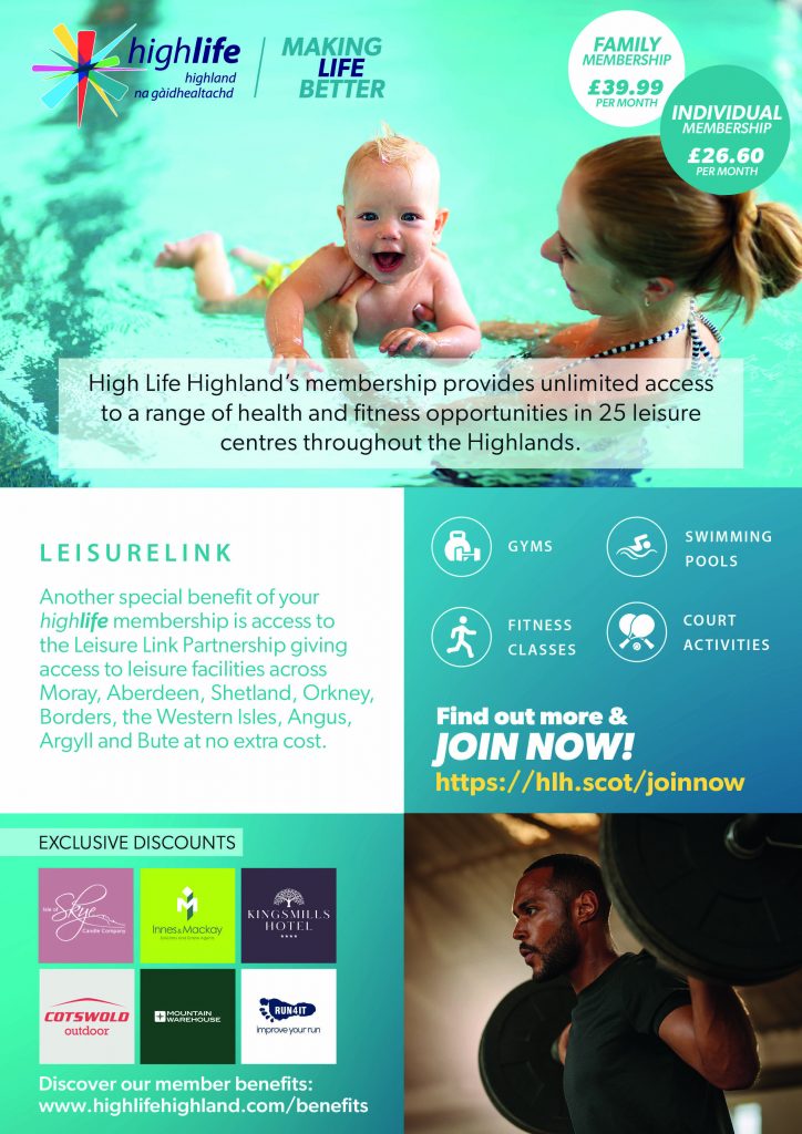 A highlife membership offers you and your family access to a range of health and fitness opportunities in leisure centres throughout the Highlands. In addition to swimming pools and gyms, your membership allows access to court activities, swimming lessons and a huge range of group exercise classes for people of all abilities and interests. Your membership also secures access to great range of local benefits as well as accessing libraries and other facilities.