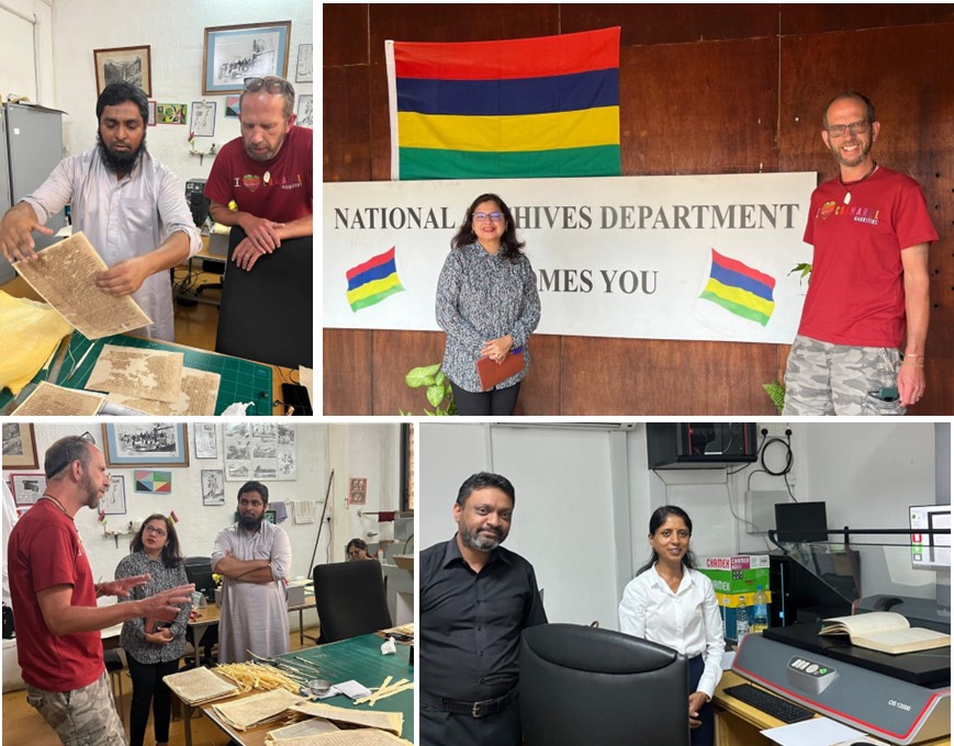 It’s been a very busy few months for our conservation team both at home and overseas! After getting married in the summer Senior Conservator, Richard, spent part of his honeymoon visiting the conservation department of the National Archives of Mauritius. He was given a tour and thoroughly enjoyed sharing knowledge with, and learning from, the team led by Mrs Razeeah Dookhan, Head of Conservation (pictured below alongside other members of her department and Richard).