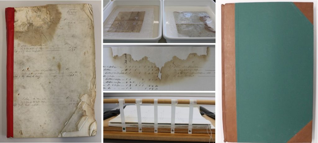 Argyll Estates were awarded a grant from National Manuscripts Conservation Trust (NMCT) to carry out the conservation of Tiree Estate Crop and Tiree Rental volumes, which were in very bad condition with extensive damp/mould damage and boards severely damaged or missing. The volumes required a phytate wash to help support and alkalise the iron gall ink as well as the paper. A phytate treatment involves washing the document in a bath of tap water 20mins; a 50/50 IMS and water bath for 20 minutes; a Phytate bath for 20 minutes, during which the solution was checked for ions; a tap water bath for 20 minutes; and finally, a calcium bicarbonate bath for 20 minutes. Once drip-dried, the document was sized with 2% gelatine size, and dried between Bondina and blotting paper under weights. Areas of loss were infilled using 40gsm Japanese paper and fragile areas and tears reinforced using 5gsm Japanese tissue. The volumes have been repaired, sewn on a sewing frame by hand and rebound in calf leather with green cloth sides. The process, and result, can be seen in the images below.