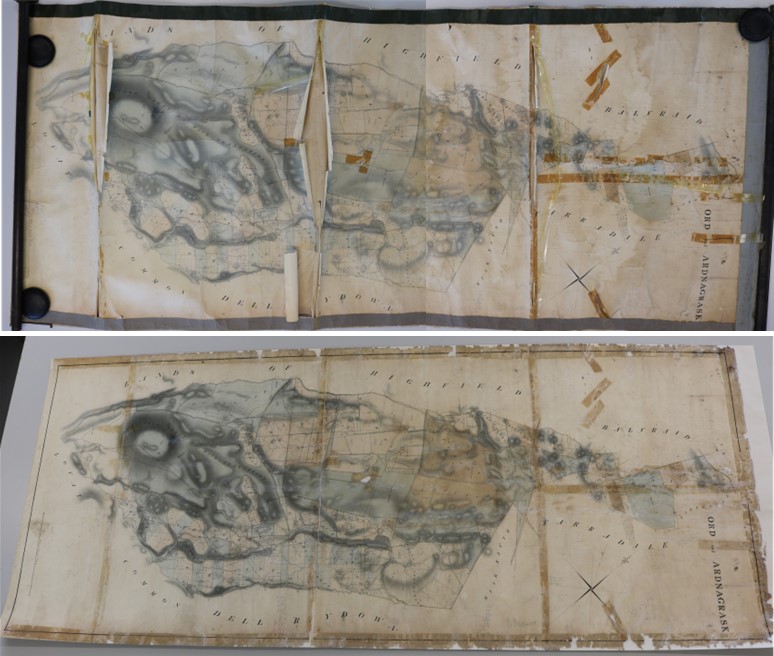 At the end of 2023 the High Life Highland Conservation Service was approached by the chair of the North of Scotland Archaeological Society (NOSAS) regarding a Tarradale plan that had been located in Bristol. The plan was transported to our studio for an assessment and the proposed conservation was awarded a GlenWyvis Goodwill Fund award later in 2024. The old linen lining was removed along with all self-adhesive repair tapes and the plan relined onto Japanese lining paper. Tears were supported using wheat starch paste and Tengucho Japanese repair tissue (see below for before and after).
