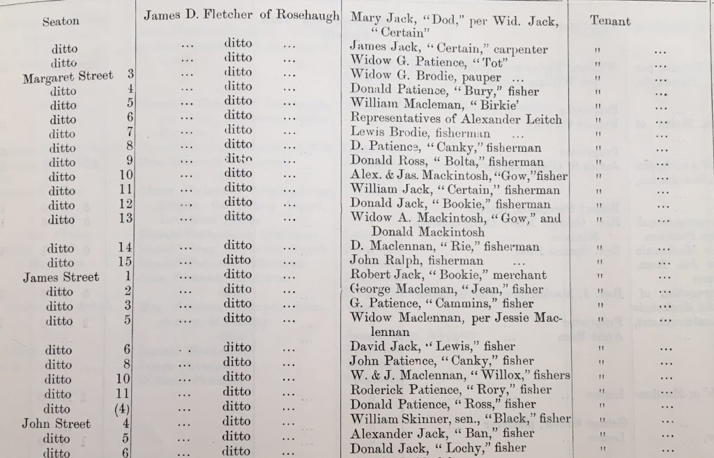 In this page from the Avoch Valuation Roll for the year 1889-90 (Ref: CRC/4/2/6) you can see several nicknames for fishermen tenants living in the parish of Avoch on the Black Isle. Common surnames at the time included Patience and Jack and nicknames like Dod, Tot, Bookie, Canky, and Rory were used.