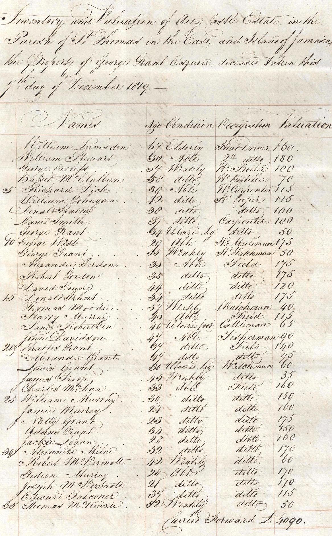 This inventory lists the monetary assets on Airy Castle estate, Jamaica, belonging to George Grant of Forres at the time of his death in 1819. The list details “property” including stock, land and slaves. The 115 slaves are listed by name with age, condition, occupation and valuation of each detailed. The estate is valued at £16,831, £10,305 of which is slaves.