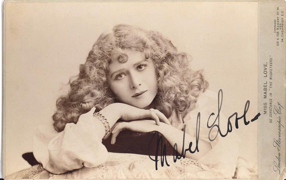 This signed postcard is of Mabel Love (1874-1953) dancer and stage actress of the late Victorian and Edwardian era. She appeared at Covent Garden as a solo dancer in various operatic ballets and also in numerous plays, pantomimes and musical comedies. She starred with famous names of the time such as Lewis Waller and Robert Loraine in London, Paris and New York. Mabel was famous for her beauty and lived in London, Brighton and Weybridge. She retired from the stage to raise her daughter, Mary Watson, and to run dance school in Knightsbridge. In 1948, Mary married B.O.A.C. Captain A.C. Loraine.
