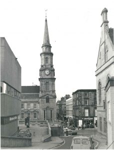 Looking down Castle Wynd towards the Tolbooth Steeple. The new Museum and Art Gallery building is on the left. c.1965