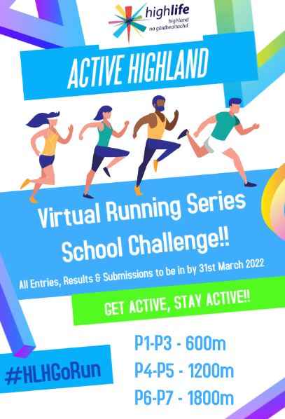 Whether as an individual, with your family or as part of a running club or school we are calling all primary aged children in the Highlands to take part in our Virtual Running Series. Each pupil who completed their local course and submits their entry will be gain an email certificate. We will also showcase the participation figures per primary school and running clubs weekly and award schools with the highest percentage of pupils taking part and the most amount of runs in the month as our ‘Active Highland Virtual Running Champions’.