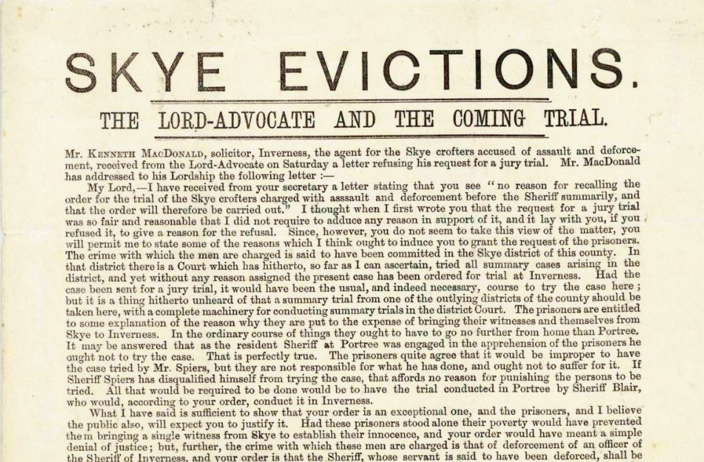 Still suffering from the cruelty and injustice of the Highland Clearances, the crofters who remained in Skye in the 1880s were dealt a new blow when they were denied access to what had once been common grazing land by landowner Lord Macdonald, effectively destroying their means of earning a living and feeding their families.