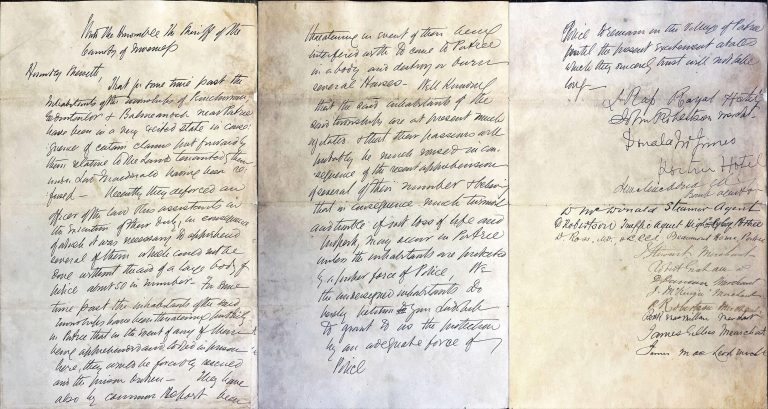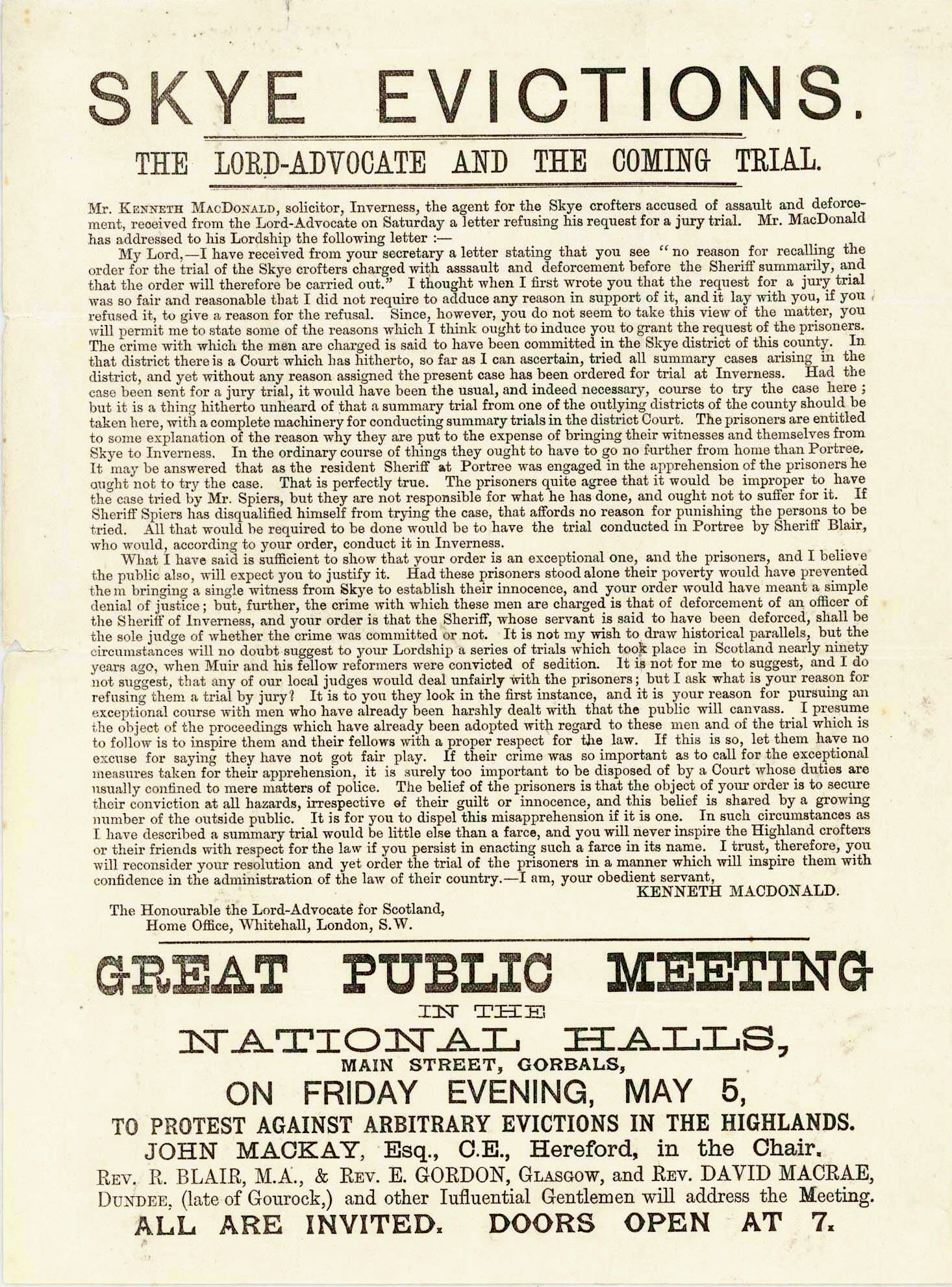 ‘Well knowing that the said inhabitants of the said township are at present much agitated and that their passions will probably be much aroused in consequence of the recent apprehension of several of their number and believing that in consequence much turmoil and trouble if not loss of life and property, may occur in Portree unless the inhabitants are protested and a further force of Police.’