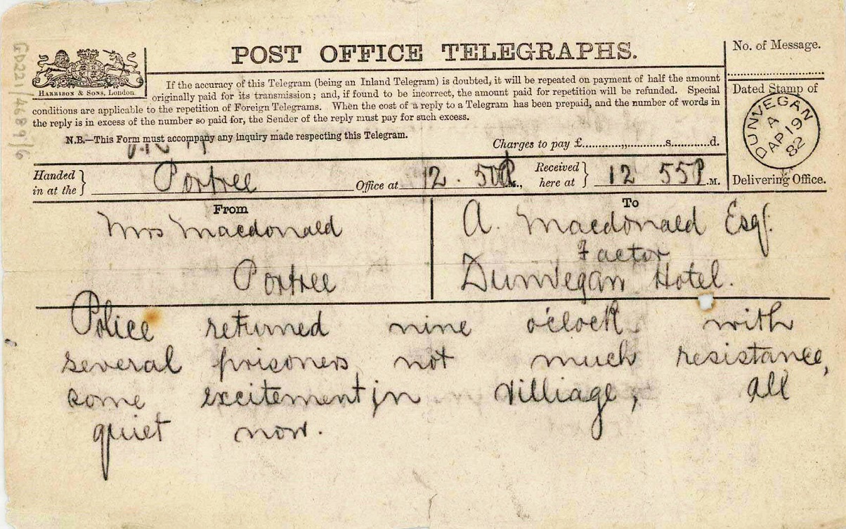The reaction of those not directly involved in the events at Braes on the 19th of April 1882 was mixed. Mrs MacDonald, wife of Alexander MacDonald, factor for Lord Macdonald’s estate, sent a telegram to her husband on the evening of the Battle suggesting everything had returned to normal.