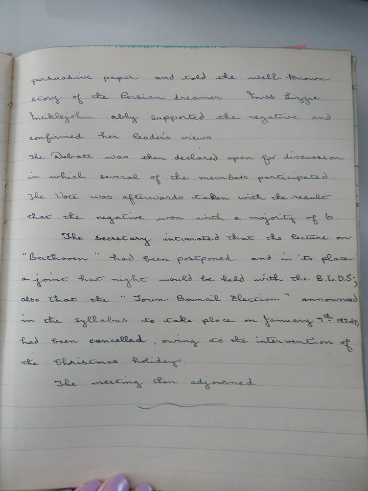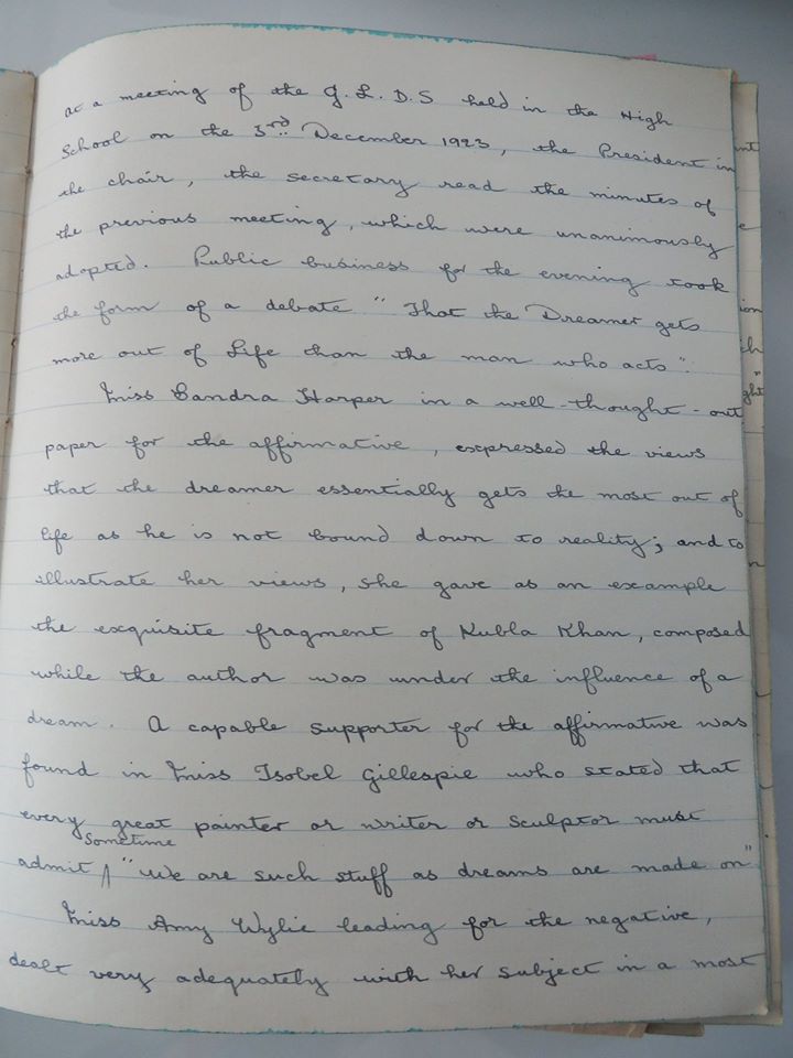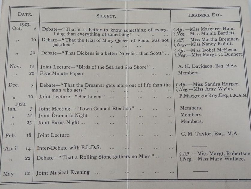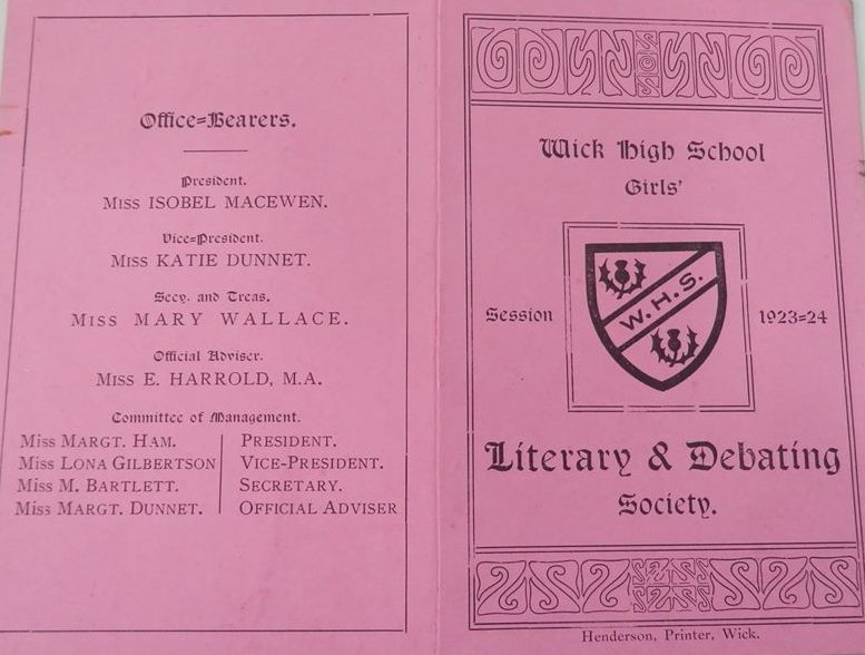 If you look at historic school records, you will notice some of the subjects are different from ones that are studied today. Below you can see some records from Wick High School Girl’s Literary and Debating Society. This includes subjects to be debated and an account of a debate. You can read a transcript of the written account here.
