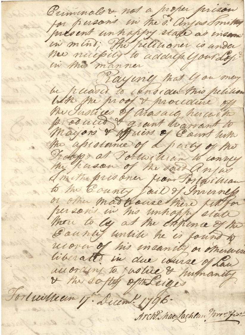 This warrant from 1796 for Angus Smith from Arisaig shows that Angus, who had been unwell for a while, was taken to jail because there was nowhere else for him to go. They recognised that Angus needed medical attention, but there were no facilities to help him.