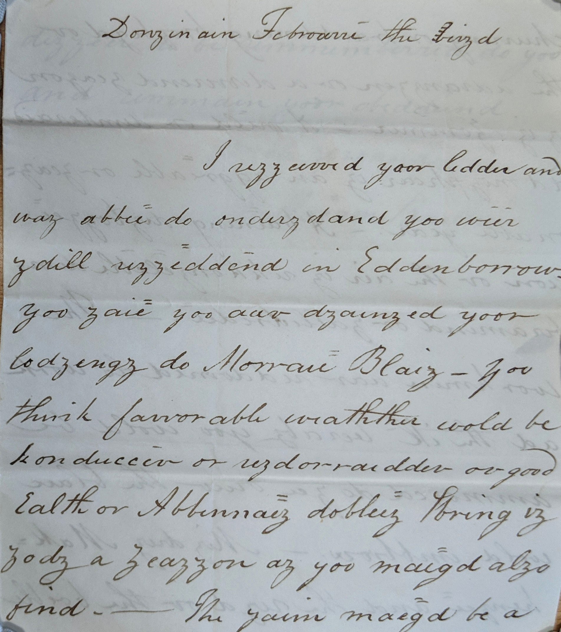 A few years later, in around 1812, William Baillie received medical attention for his mental health. William was from a very wealthy and landowning family, and because of this he went down to London to see a doctor there for treatment. While he was away from his home, William wrote letters to his sister in Inverness. He took to writing some of his letters phonetically – this is when you write things how they sound. They look impossible to read when you see the words, but if you sound out the words it makes sense!