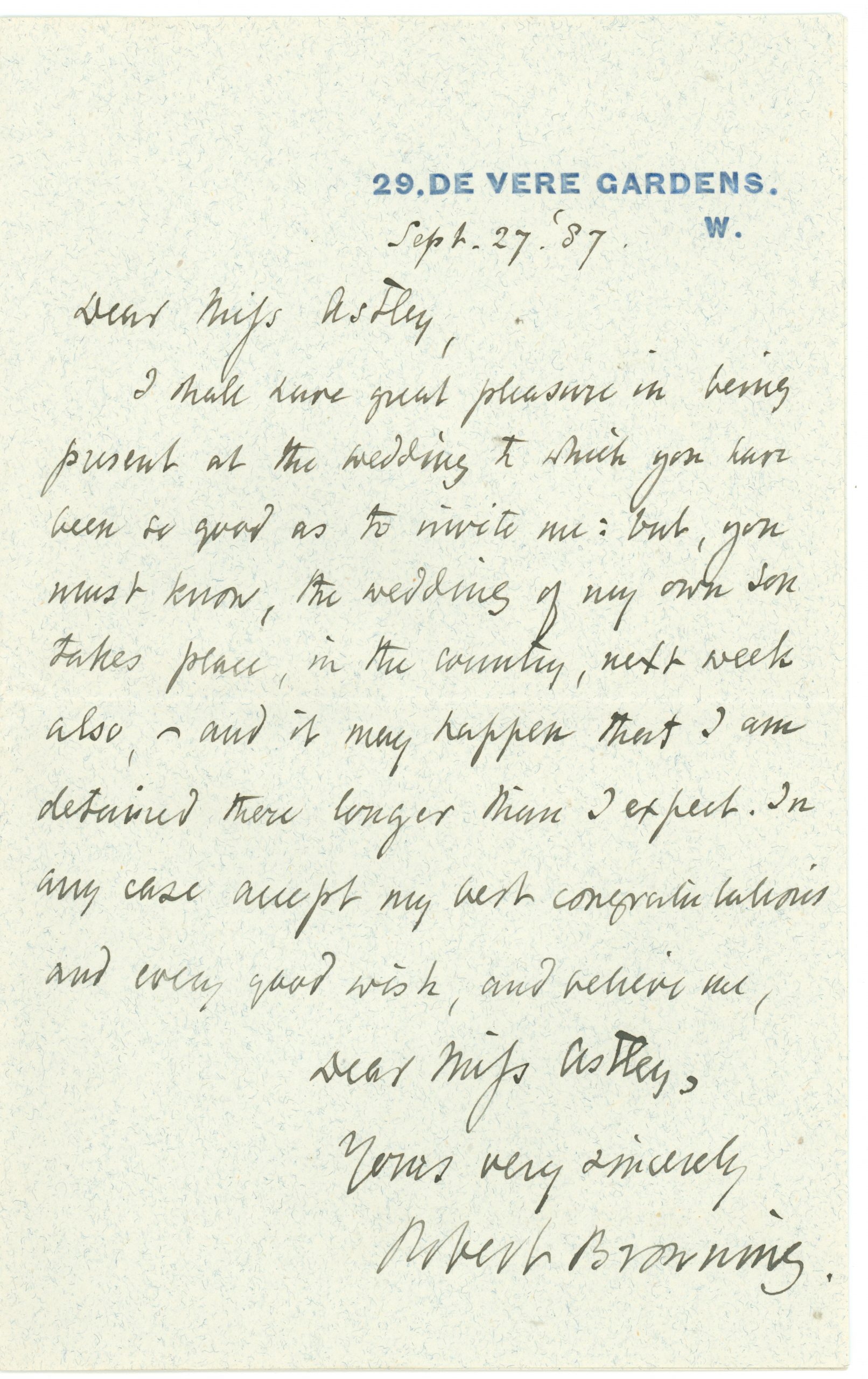 This letter is from Robert Browning, who was an author. His works include ‘My Last Duchess’ and ‘Porphyria’s Lover’.