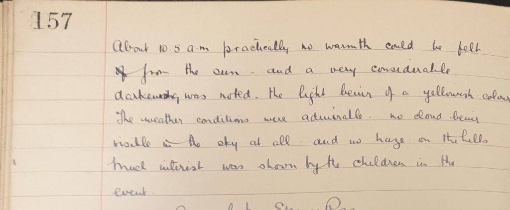 “The morning school was not really commenced until 10.45. A very fine eclipse of the sun was visible, and all were very interested in watching the travelling of the moon. Each was supplied with a smoked glass and from the wall adjoining the playground the view was very fine. None were able to see the starts which were supposed to be quite visible. About 10.5 a.m practically no warmth could be delt from the sun and a very considerable darkening was noted, the light being of a yellowish colour. The weather conditions were admirable, no cloud being visible in the sky at all, and no haze on the hills. Much interest was shown by the children at the event.”
