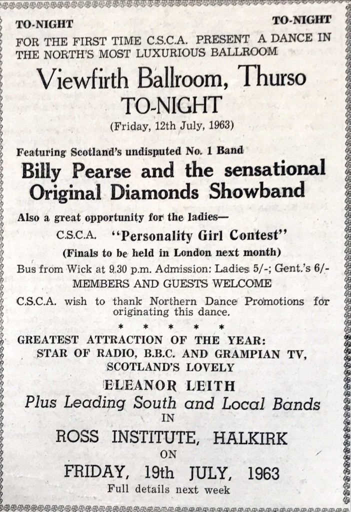 1963 saw the Bill Pearse Showband play the Viewfirth, described as ‘the North’s most luxurious ballroom’. An advertisement from the John O’Groat Journal is shown below.
