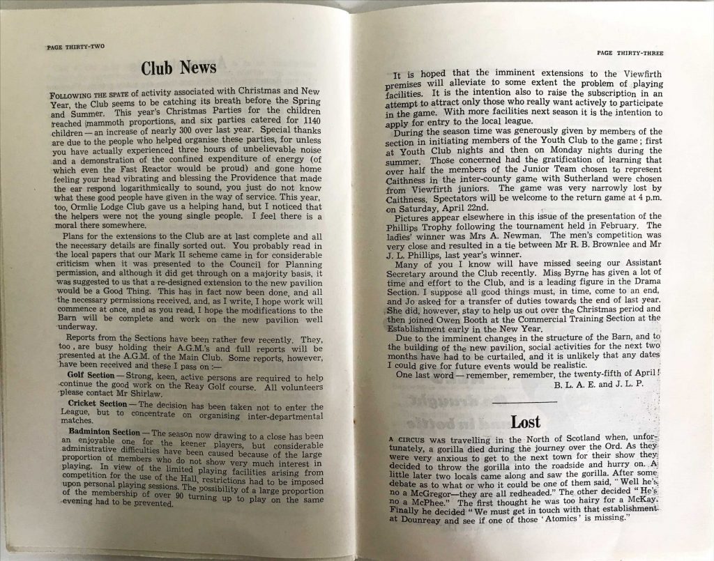 By September 1958, membership of the DSSC had reached 1100 out of a staff complement of 1600. At this early stage membership favoured those Dounreay employees who lived in Thurso rather than those who lived at a distance in Wick, Lybster, Dunbeath or Bettyhill…Recognising that the fullest possible integration with the people of the town was a necessity, the Dounreay club was the only one in the UKAEA which catered for non-employees: another location-specific concession to place which highlights the significance of Dounreay’s social impact.’