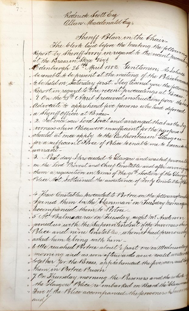 An entry in the Police Committee minute book for the 13th of April 1882 details the incident. Sheriff Ivory received a report on the recent proceedings at Braes.
