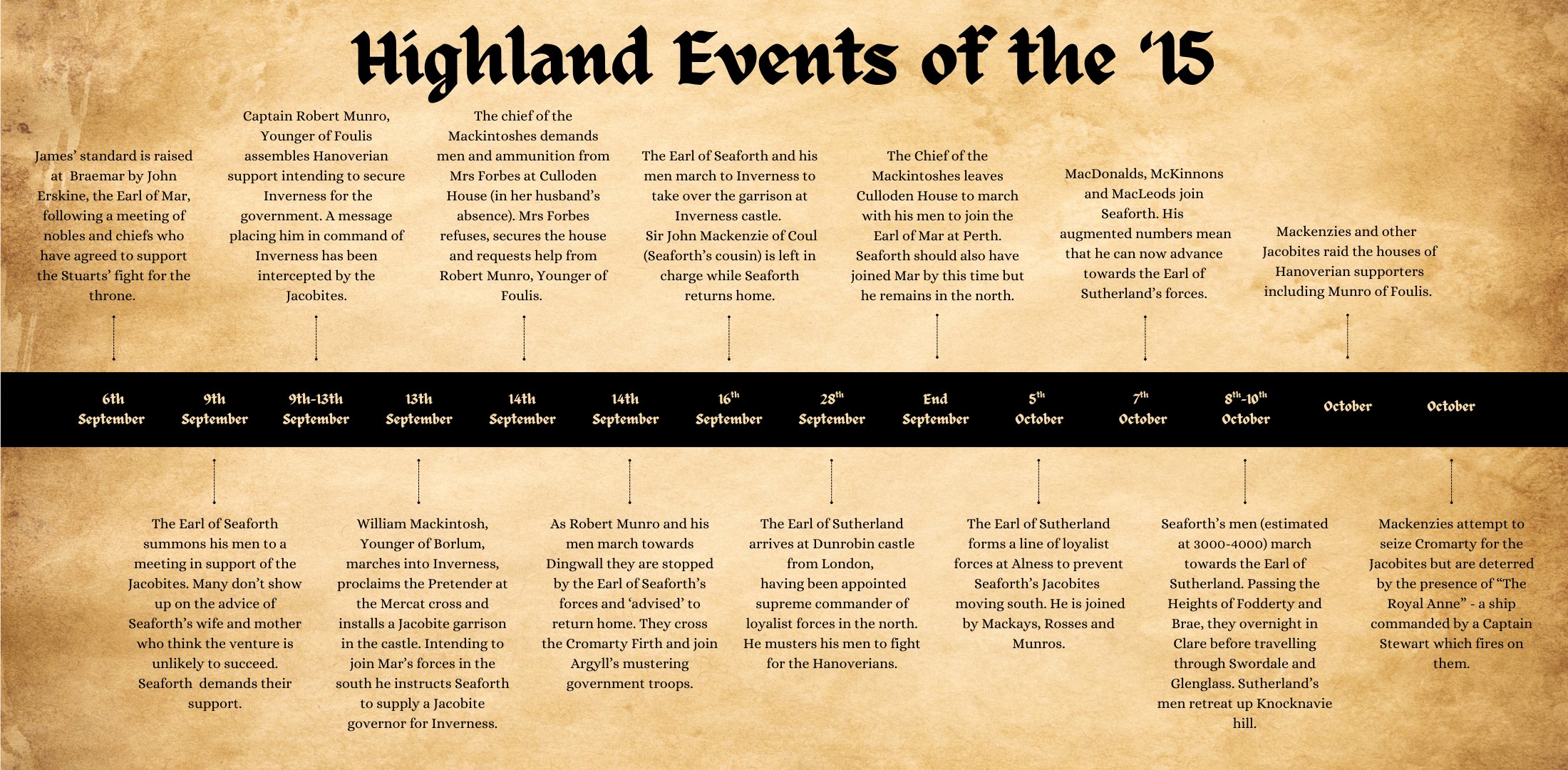 The north of Scotland, along with the rest of the country, became a stage for skirmishes between the opposing factions. The Earl of Seaforth’s men became embroiled in standoffs with both the Earl of Sutherland and Munro of Foulis. These fights, gaining and losing ground throughout the Cromarty Firth area, delayed the Earl of Seaforth to such an extent that he was two months late taking his forces to join Mar’s army. This delay likely contributed to the failure of the rising as Mar waited for augmented forces before marching south to confront the Hanoverians.