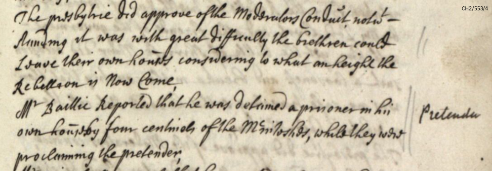 The presbytery did approve of the moderator’s conduct notwithstanding it was with great difficulty the brethren could leave their own houses considering to what height the Rebellion is now come. Mr Baillie reported that he was detained a prisoner in his own house by four sentinels of the McIntoshes, while they were proclaiming the pretender.
