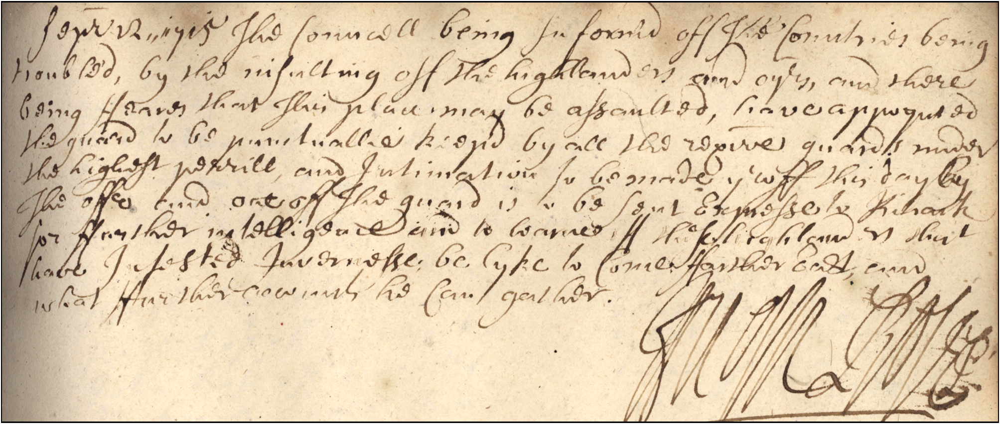 September 12th 1715, The Council being informed of the country’s being troubled by the insulting of the Highlanders and others and there being fears that this place may be assaulted, have appointed the guard to be punctually kept by all the respective guards under the highest peril, and intimation to be made thereof this day by the officer and one of the guard is to be sent express to Kilravock for further intelligence and to learn if the Highlanders that have infested Inverness be like to come further east and what further accounts he can gather.