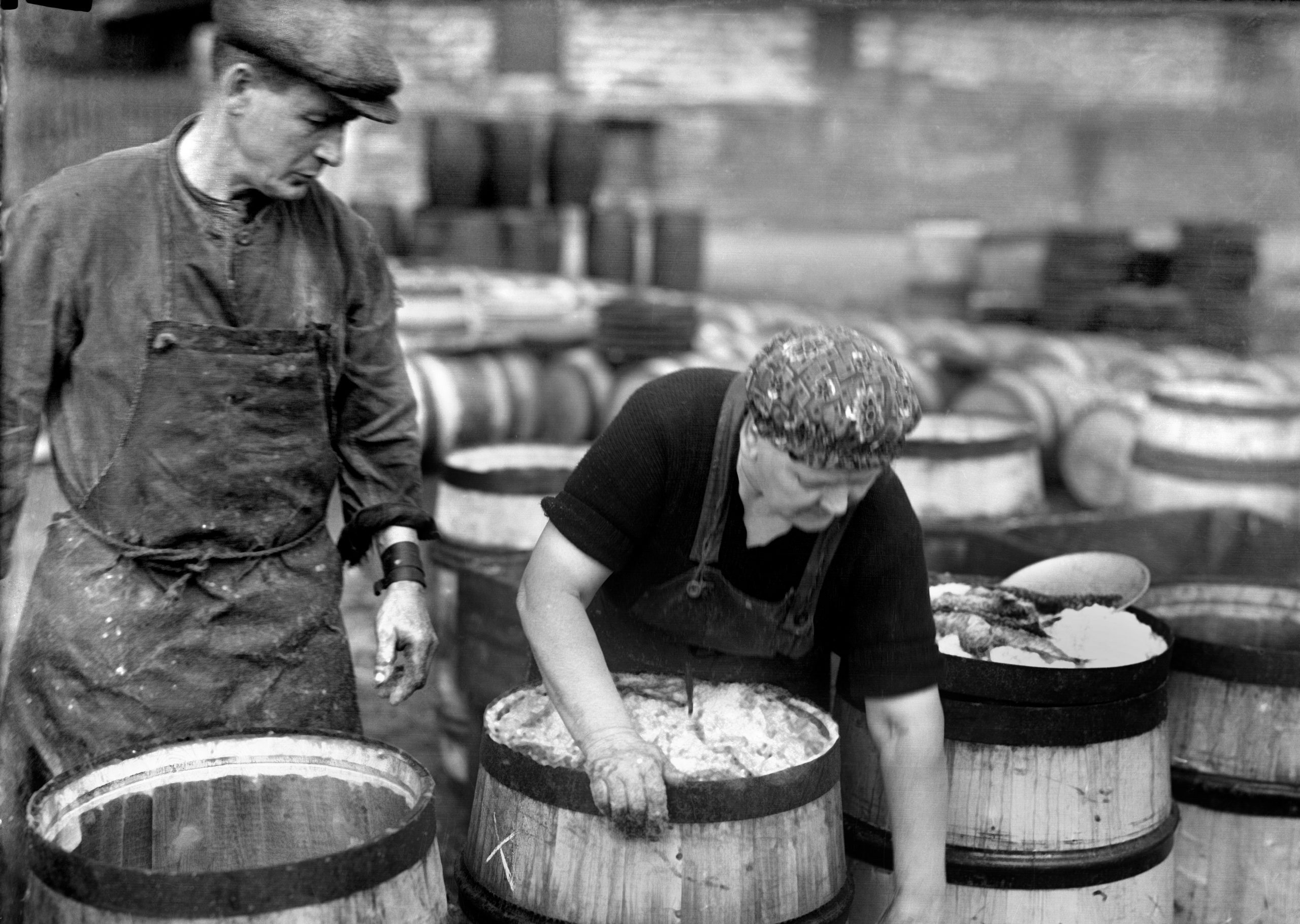 After gutting, the packer would then arrange the herring in layers like a rosette, with their bellies facing up, and their heads toward the outside of the barrel. Each layer was given a generous sprinkling of rough salt, under the watchful eye of an experienced cooper.