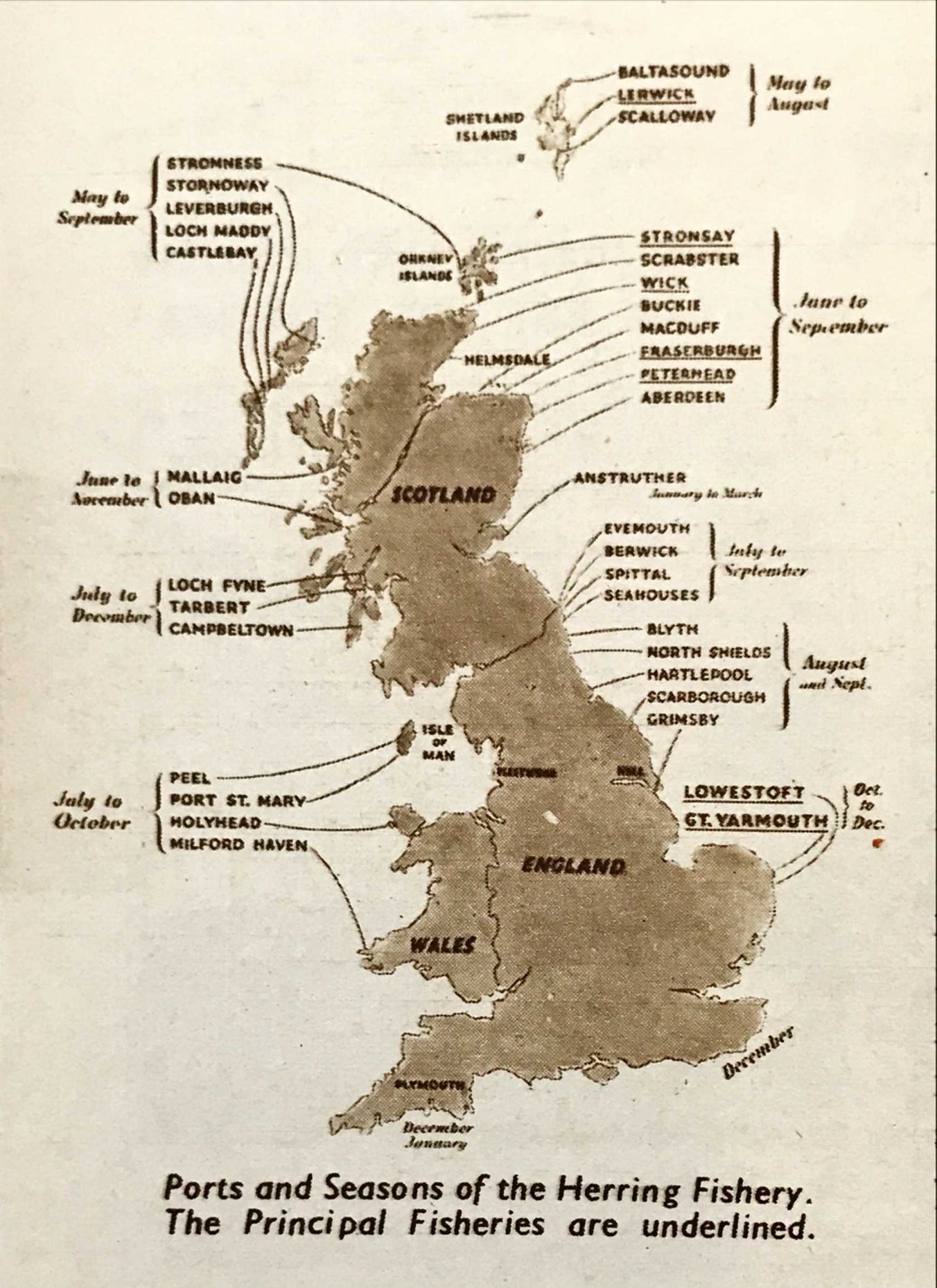 This map shows the Ports and Seasons of the Herring Fishery. The major ports are underlined.