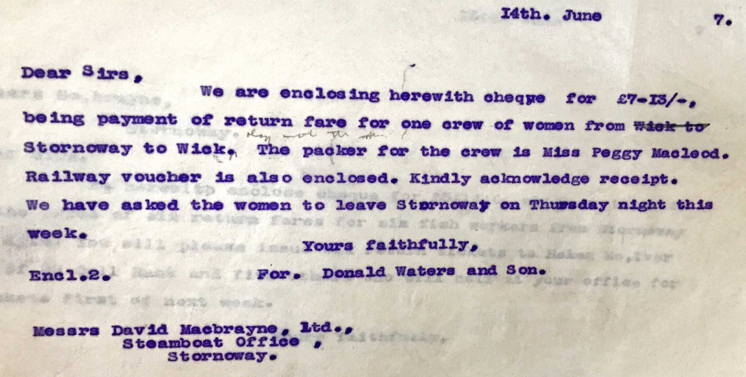 From this letter below to the Steamboat Office in Stornoway enclosing payment for Peggy and her crew’s travel to Wick, we learn that Peggy was the packer in her crew.