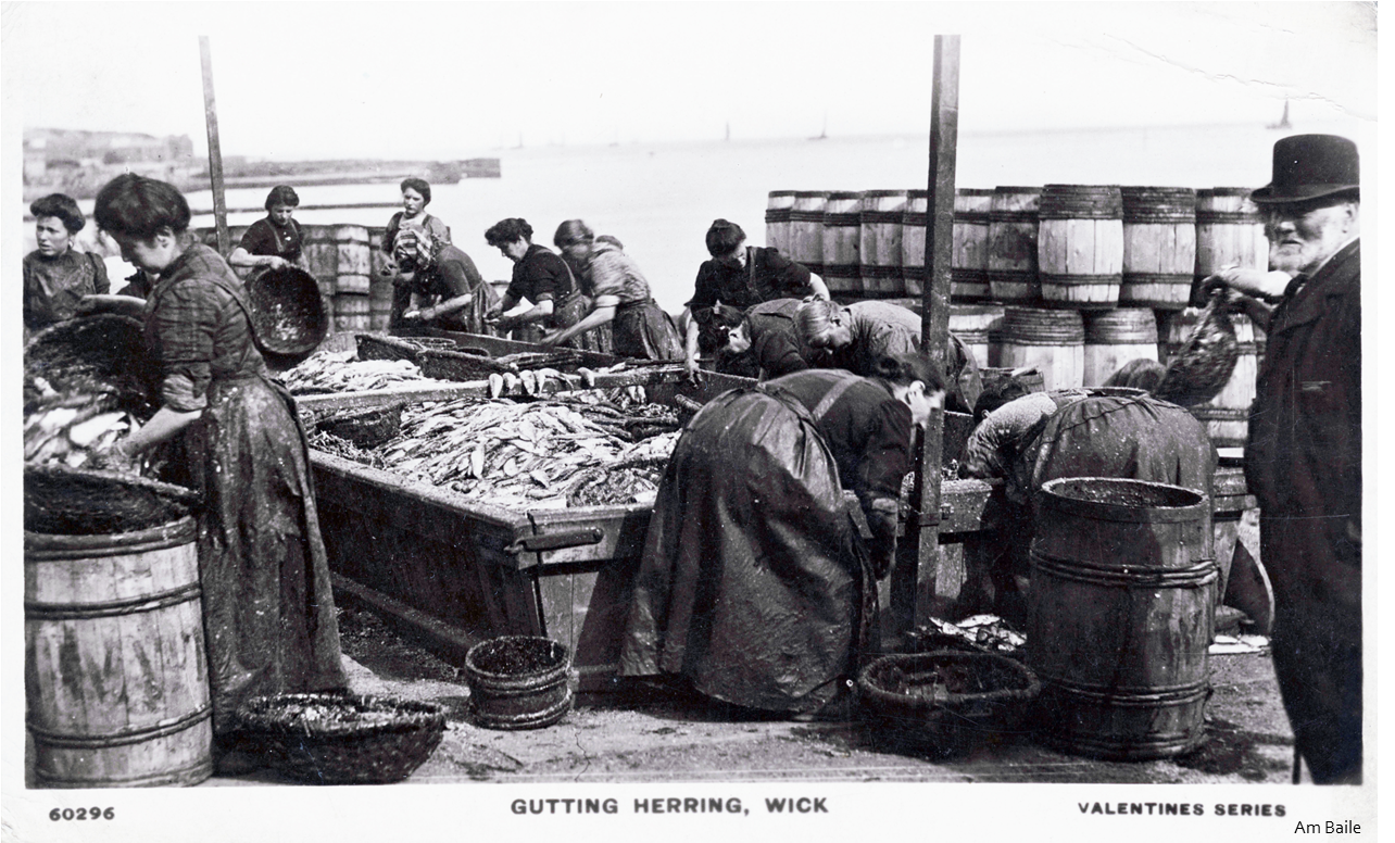 The above photograph shows groups of women gutting fish. The herring fishing season in Wick usually ran through June, July and August. The gutters spent around 12 weeks here before following the herring shoals south. Many of the herring girls came from the Hebrides. They stayed in dormitories above fishcuring yards, or lodged with local people.