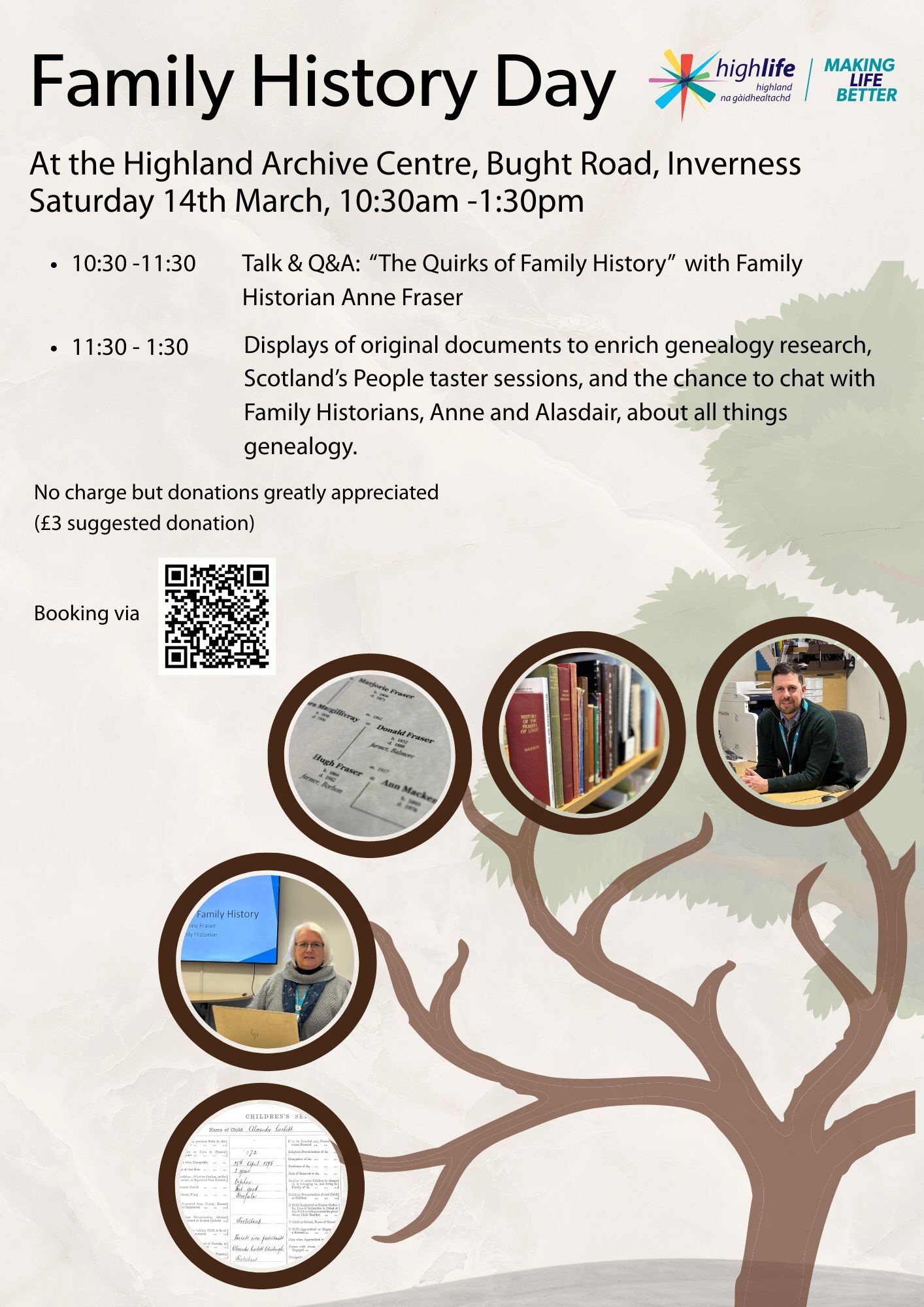 11:30 - 1.30 - Displays of original documents to enrich genealogy research, Scotland’s People taster sessions, and the chance to chat with Family Historians, Anne and Alasdair, about all things genealogy.