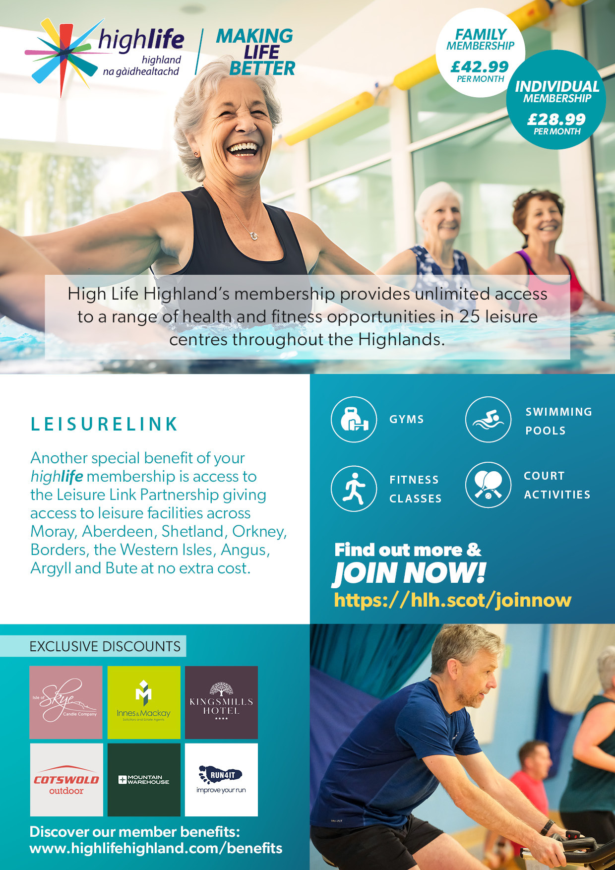 A highlife membership offers you and your family access to a range of health and fitness opportunities in leisure centres throughout the Highlands. In addition to swimming pools and gyms, your membership allows access to court activities, swimming lessons and a huge range of group exercise classes for people of all abilities and interests. Your membership also secures access to great range of local benefits as well as accessing libraries and other facilities.