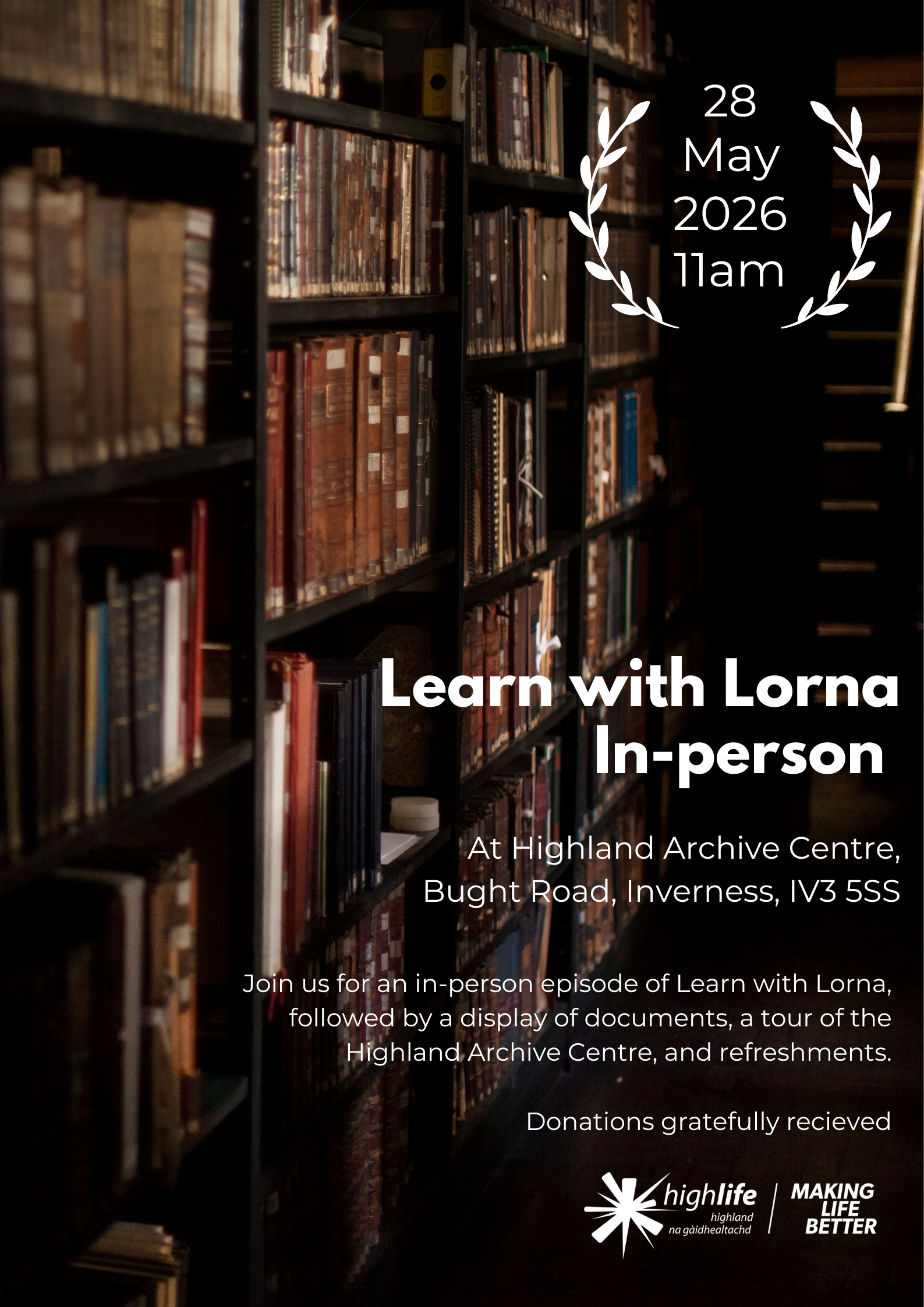 Our series of online short talks about the records held by the Highland Archive Service is taking a short break over the festive period, returning on 22nd January 2026. In the meantime, you can catch up with all previous episodes on our YouTube channel and we're excited to announce that at the suggestion of a Learn with Lorna viewer who's been watching since episode 1, we are going to be hosting an in-person Learn with Lorna event at the Highland Archive Centre on 28th May 2026. A talk on some "Treasures of the Highland Archive Service" will be followed by the chance to see some of the many documents that have featured across the 6 years of the series and to meet some of the other team members who have contributed research over the years. We are really looking forward to welcoming LWL viewers to the archive centre, celebrating the community that has grown from the series, and saying thank you to all who have helped it grow. Whether you've never been in to the archive centre before, or whether you've been in hundreds of times, we'd love to see you at this event so please save the date!