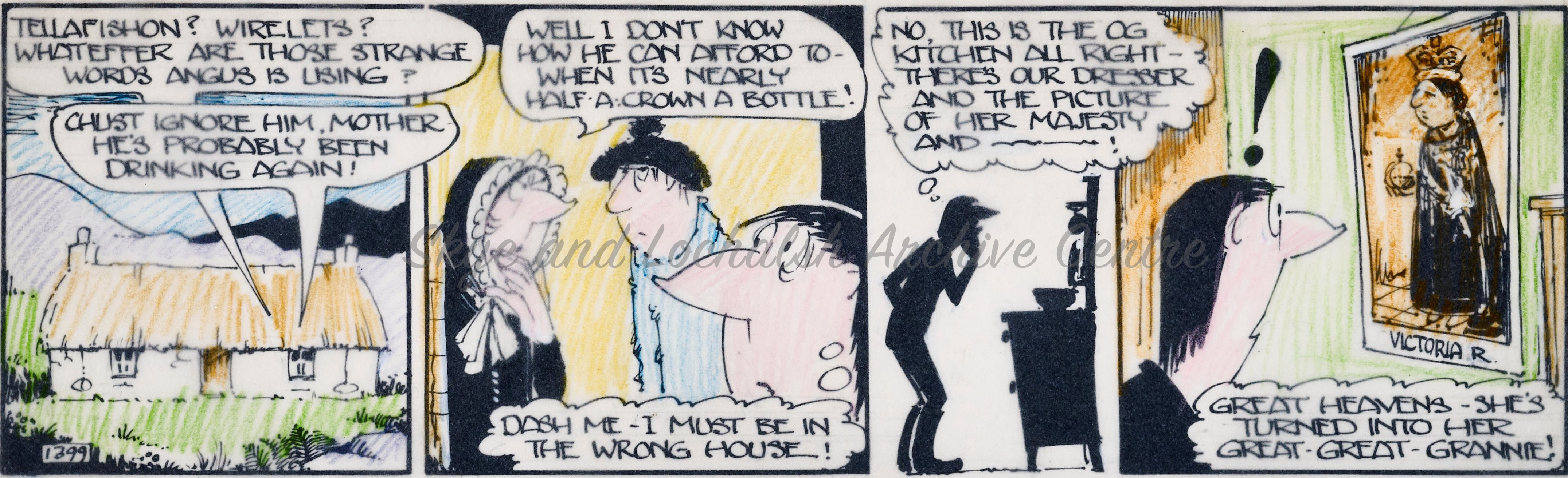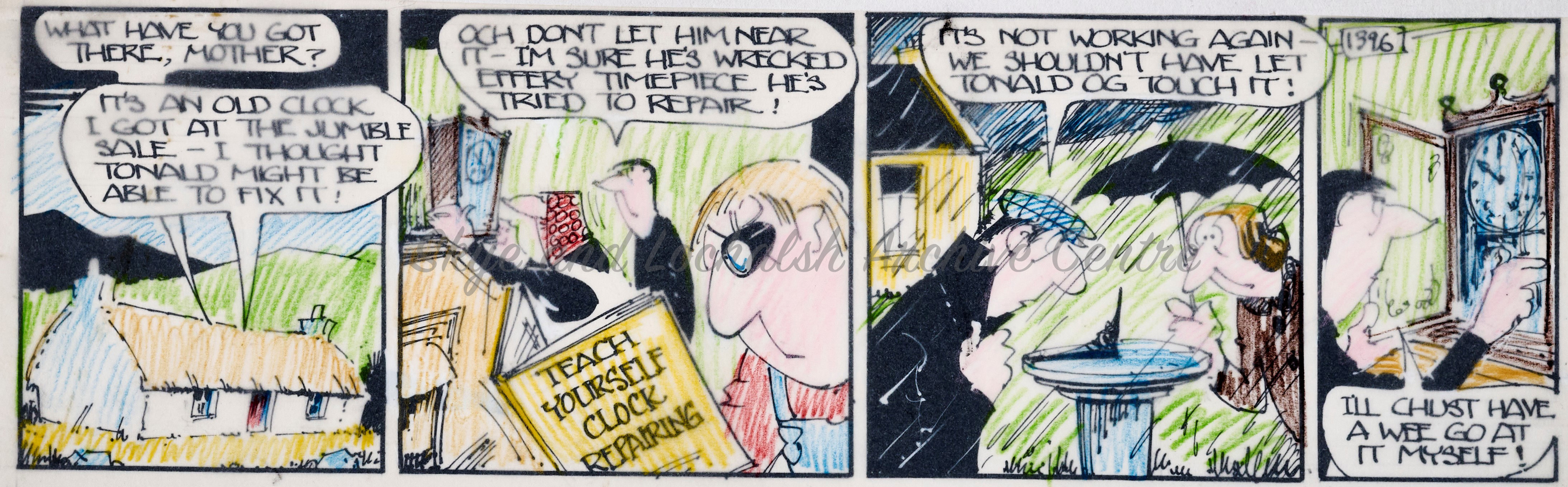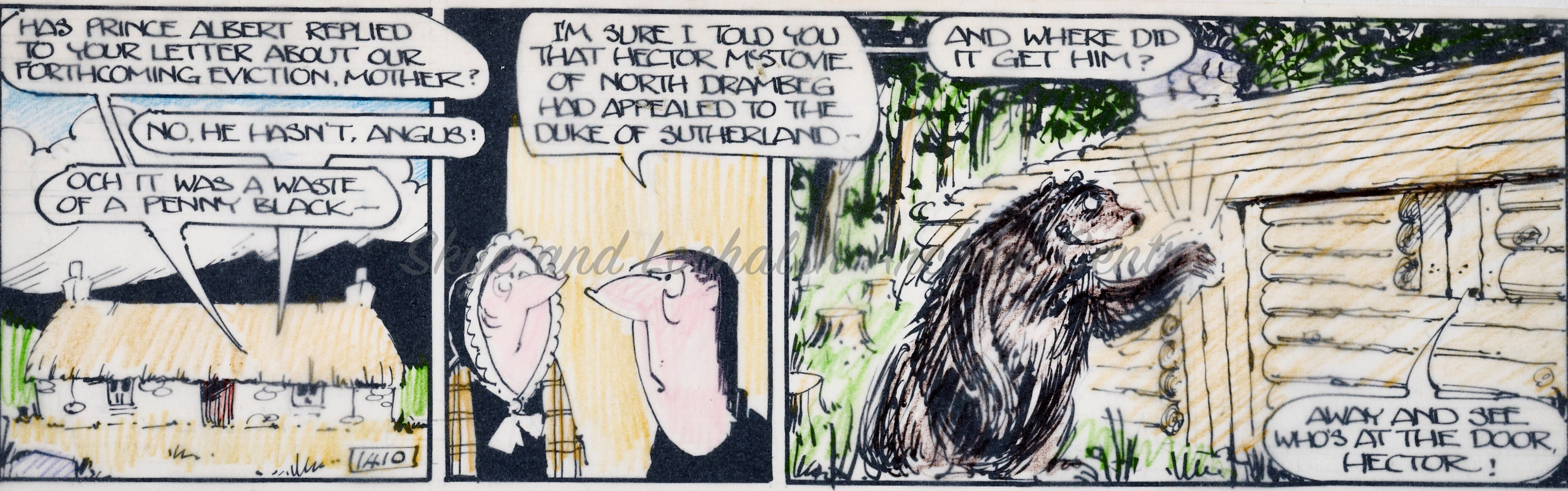 Angus Og, the wily highlander and his friends from the fictional Island of Drambeg in the Utter Hebrides were familiar faces to many folk across Scotland throughout the latter half of the 20th Century. The Angus Og cartoon series was created by cartoonist Ewen Bain and first appeared in the Bulletin before being published in the Daily Record from 1960 through to 1989. There were 158 Angus Og adventures, each made up of multiple beautifully drawn pen and ink cartoon strips.
