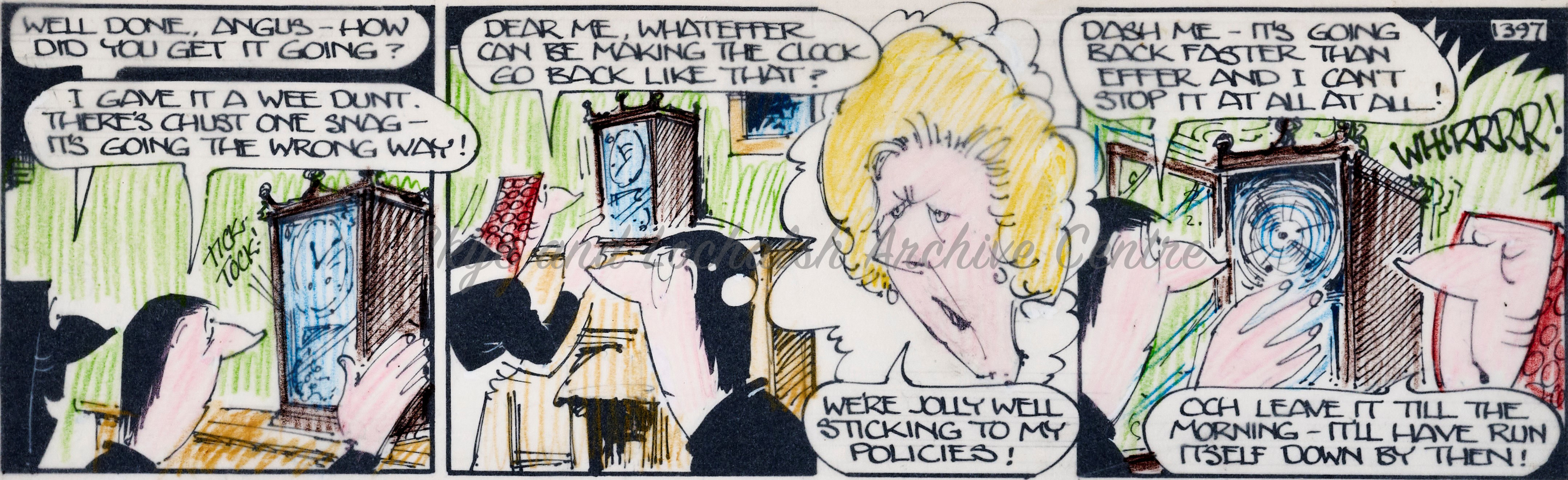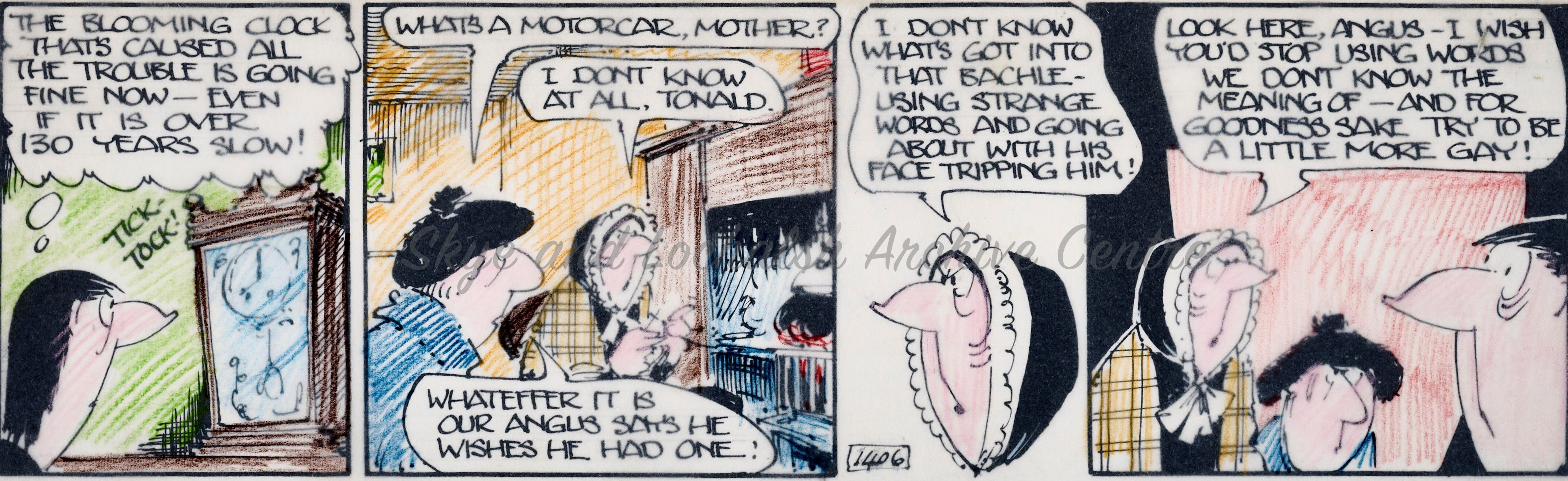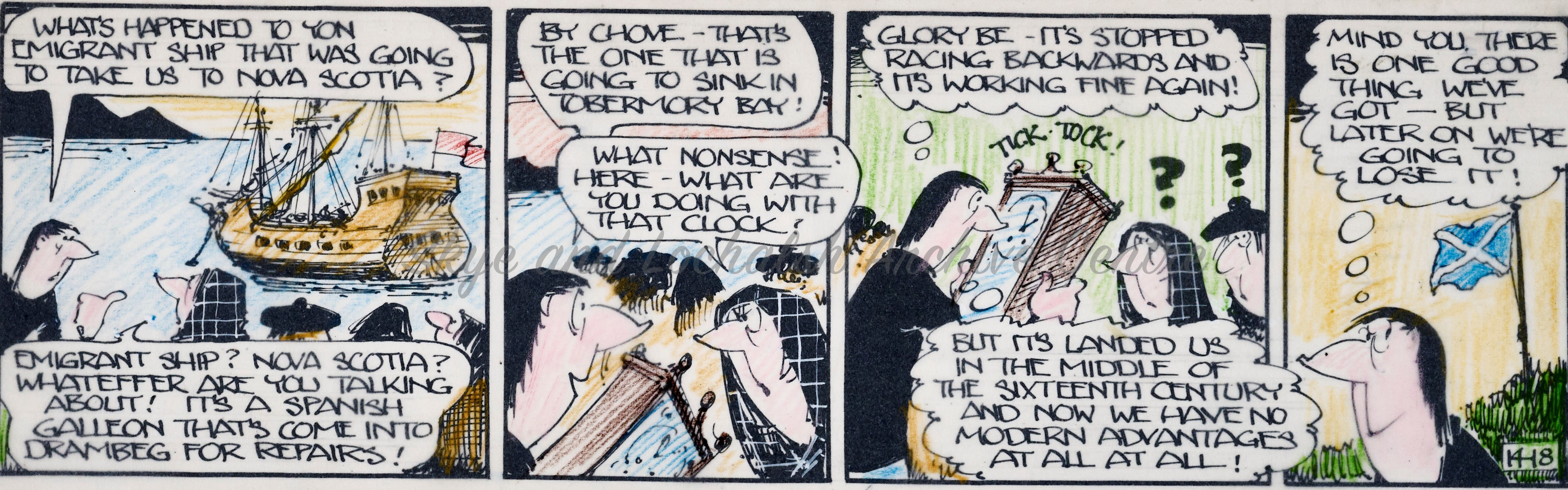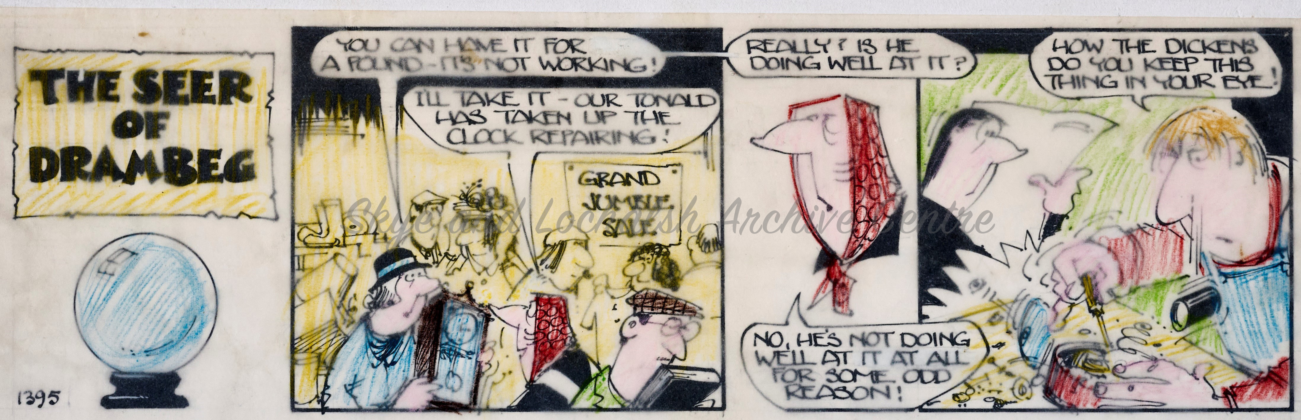 Angus Og, the wily highlander and his friends from the fictional Island of Drambeg in the Utter Hebrides were familiar faces to many folk across Scotland throughout the latter half of the 20th Century. The Angus Og cartoon series was created by cartoonist Ewen Bain and first appeared in the Bulletin before being published in the Daily Record from 1960 through to 1989. There were 158 Angus Og adventures, each made up of multiple beautifully drawn pen and ink cartoon strips.
