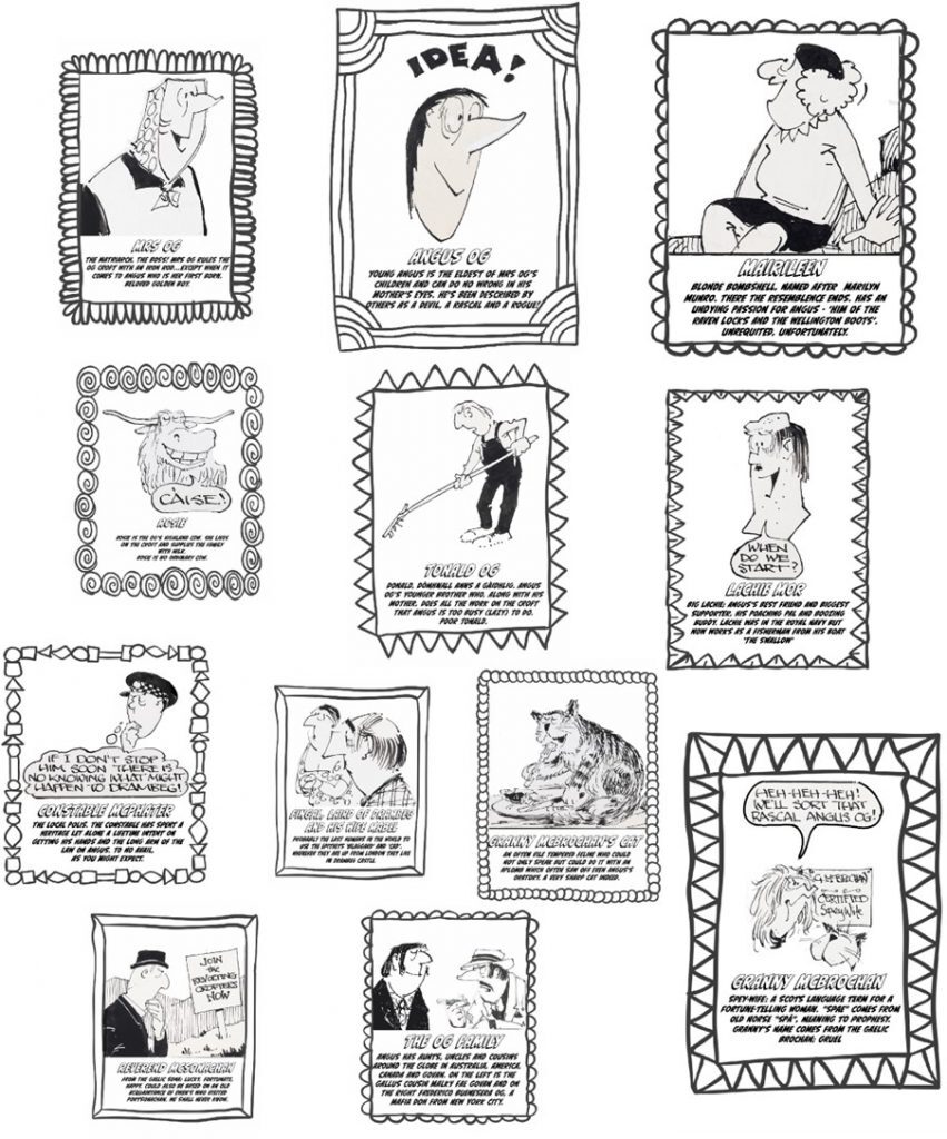 Ewen Bain first thought up the character of Angus Og after an editor at The Bulletin suggested he come up with an idea for a cartoon strip. Ewen, who described himself as a ‘Skye-man from Maryhill’ says in Gàire, Acair 1990, that he was inspired by some of the characters he met in the Isle of Skye, older men who still lived with their mothers who treated them as if they were still adolescents! He thought probably you saw similar characters in other islands and with that idea Angus Og was born!