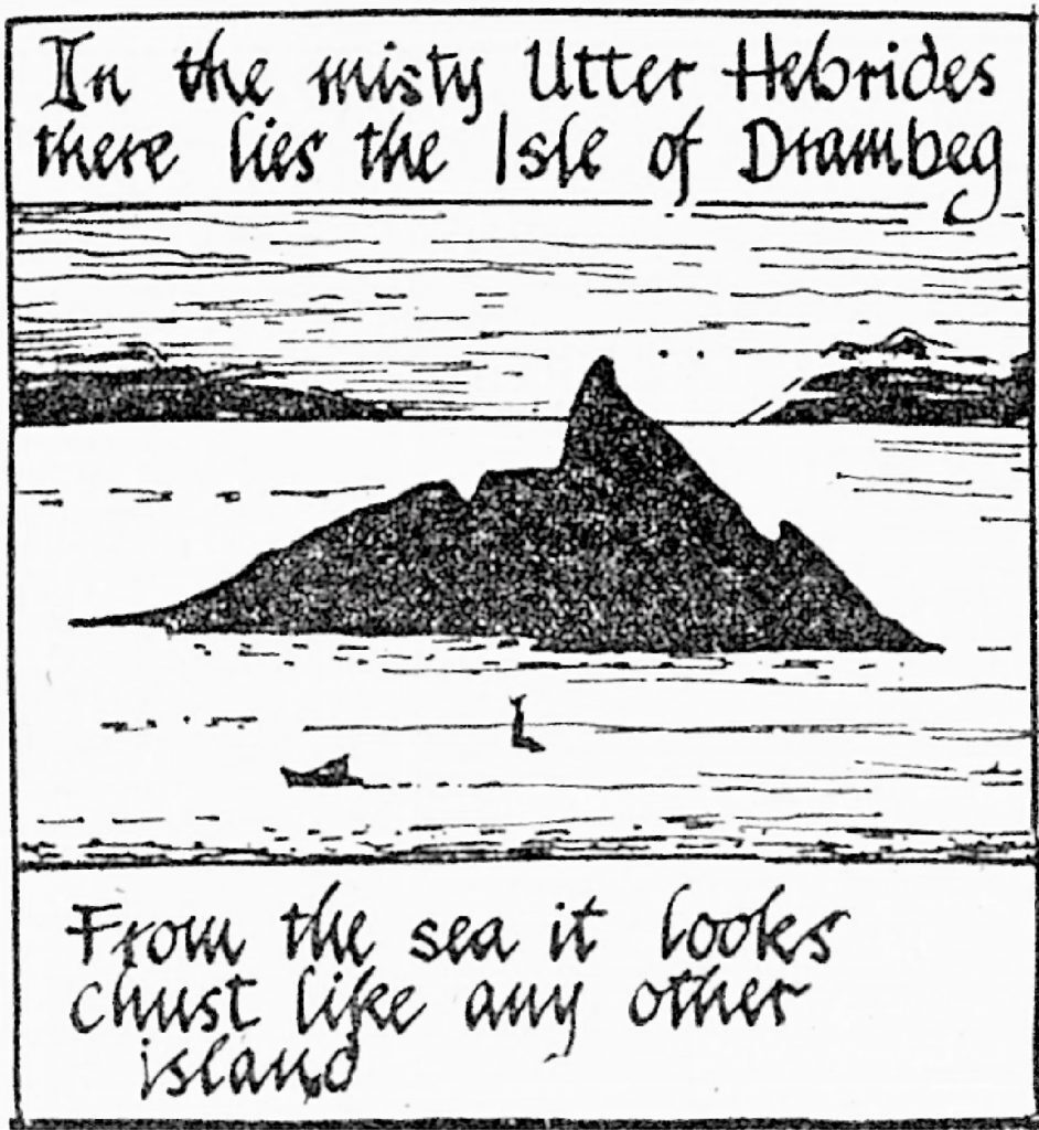 Wisely, Ewen decided not to set the adventures of Angus Og in Skye and realised that a new, fictional island, possibly inspired by several real-life islands, would allow him more artistic freedom. The Island of Drambeg is (usually) situated off the west coast of Scotland in the Utter Hebrides. It is, most likely, a composite of all the Hebrides but elements of this fictional island are undoubtedly inspired by Skye; you take the ferry to Drambeg from Kyle, there is a ridge of hills that run across the island that are reminiscent of the Cuillins or the Trotternish Ridge and which feature a distinctive pinnacle of rock called the Old Man of Ben Oovi and just as they did in Skye in 1880s the British Government sends troops to quash the revolting crofters!