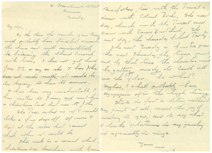 "The Prov[ost] has asked me if I would like a few days off. Of course I leapt at the idea but cannot think when it could be. This week is a social whirl. Christmas Day, Luncheon with General MacFarlane, tea with the Provost and dinner with Colonel Roche. The next day, Lunch with the Provost and Dinner with Canon B. The next day, the Sunday School Party.