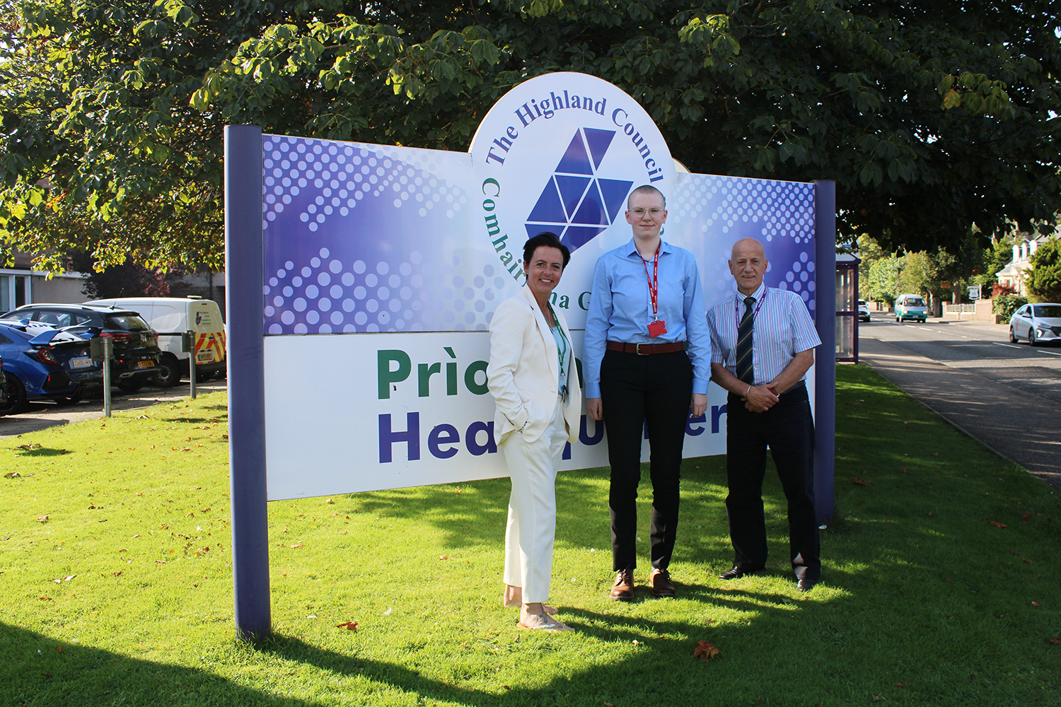 Photo outside of The Highland Council HQ: (L-R) Executive Chief Officer for Education and Learning, Nicky Grant; Highland Youth Convener, Orla MacLeod; Education Chair, Cllr John Finlayson. Photo provided by The Highland Council.