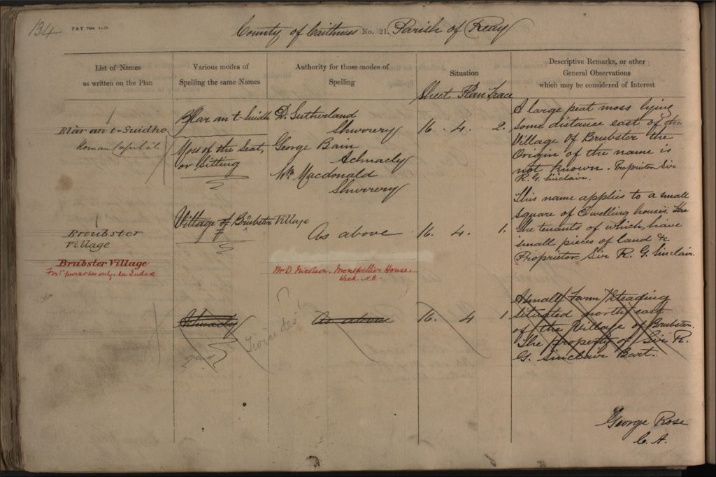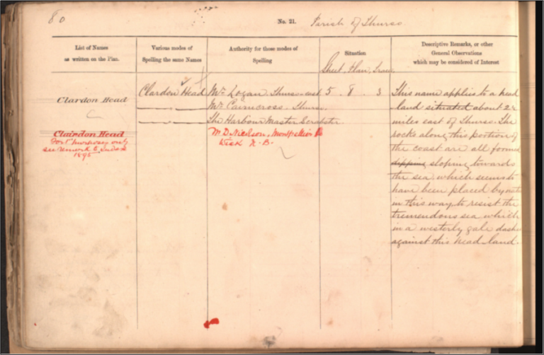 He was well known in and beyond Wick for his dialect word lists, and his contributions to Northern Scottish philology assumed many forms. The entries for Nicolson’s spellings of ‘Brubster Village’ and ‘Clairdon Head’ in the Caithness Ordnance Survey Name Books below indicate that he was considered an authority voice by many (see entries highlighted in red).