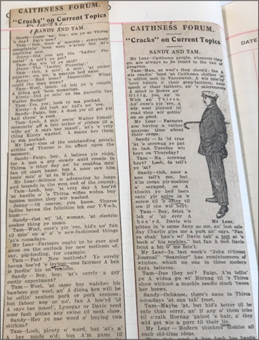 As the clipping below from the Caithness Dialect album shows, the dialogue between Sandy and Tam was written in such a way as to represent both the accent and dialect of Caithness. Their vernacular is offset by the character Mr Lear whose use of Standard English and perspectives on local issues suggest he is an incomer (someone who lives in Caithness having relocated from elsewhere). At first glance, an incomer or visitor to Caithness might struggle to follow the conversation.