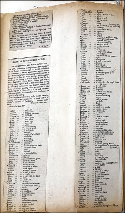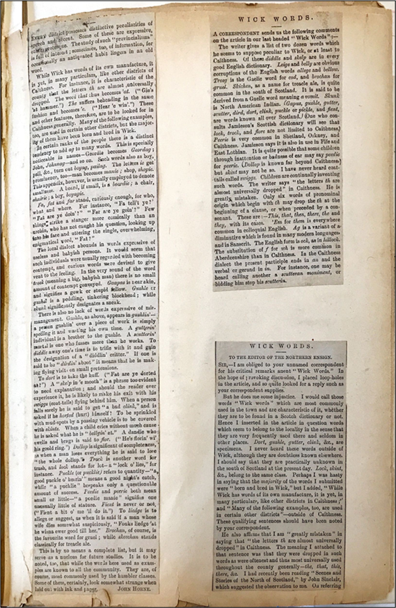 This position is neatly summed up in the opening of Nicolson’s letter, dated 2 March 1894, to his former pupil Horne. The letter’s significance is emphasized by its place of prominence on the inside front cover of the Caithness Dialect album. Referring to Horne’s ‘last list’ of Wick dialect words in the Ensign, Nicolson writes:
