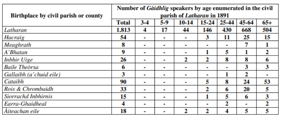 Almost all recorded Gaelic speakers in the county were born before 1891, which means that the intergenerational transmission of the language had effectively already ceased.[46] Consequently, the Registrar General of the 1911 Census concluded that the language was no longer in ‘habitual use’ in Caithness.[47]