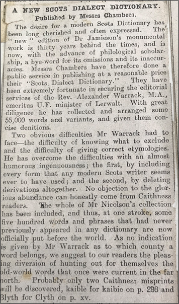 Naming Nicolson as an important contributor, the John O’Groat Journal issued a press release for the ‘New Scots Dialect Dictionary’ by ‘Messrs Chambers’. Horne meanwhile paid tribute to his former teacher by including the Groat press release in his Caithness Dialect album.