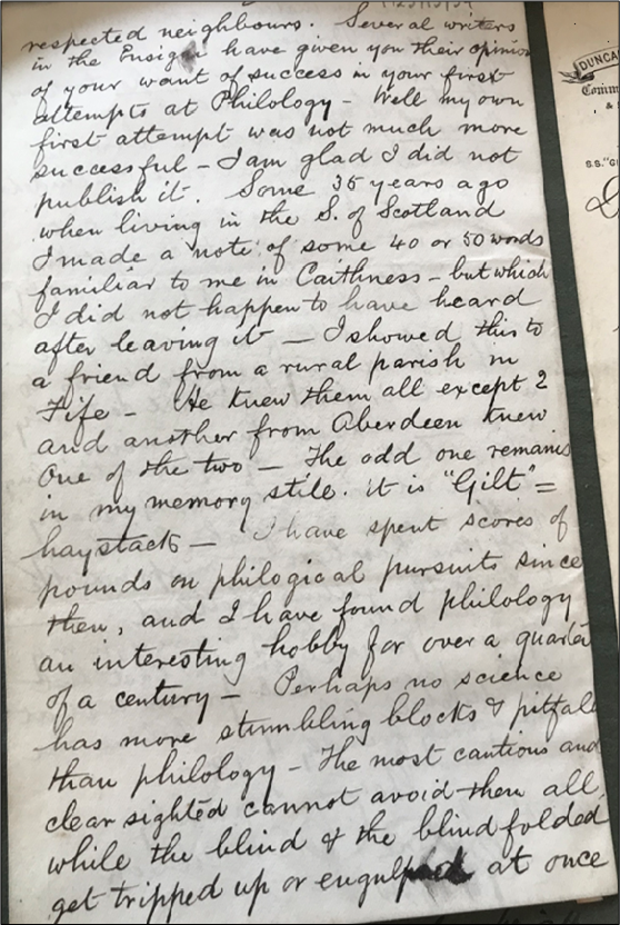 ‘Some 35 years ago when living in the S[outh] of Scotland I made a note of some 40 or 50 words familiar to me in Caithness – but which I did not happen to have heard after leaving it – I showed this to a friend from a rural parish in Fife – He knew them all except 2 and another from Aberdeen knew one of the two’