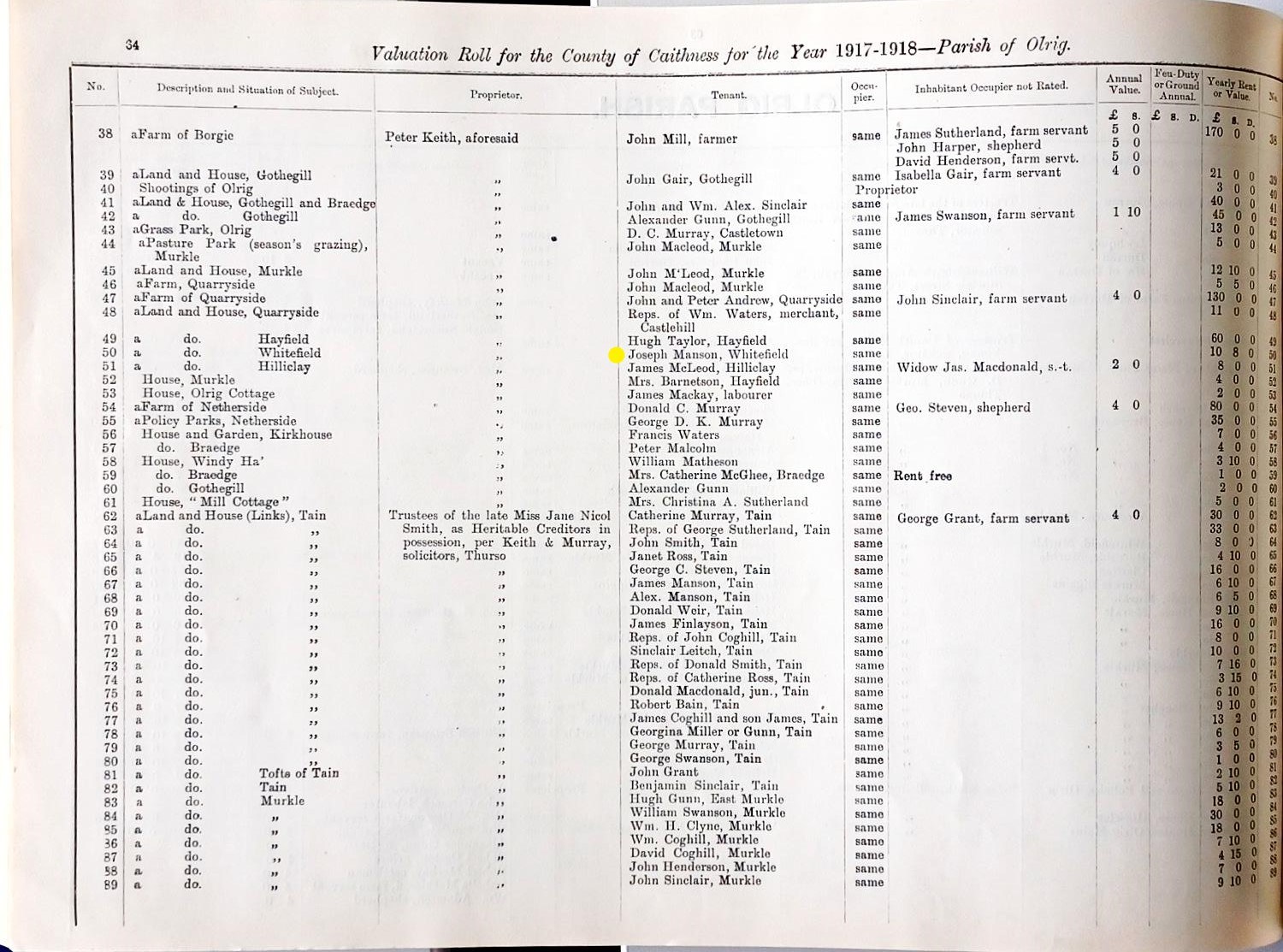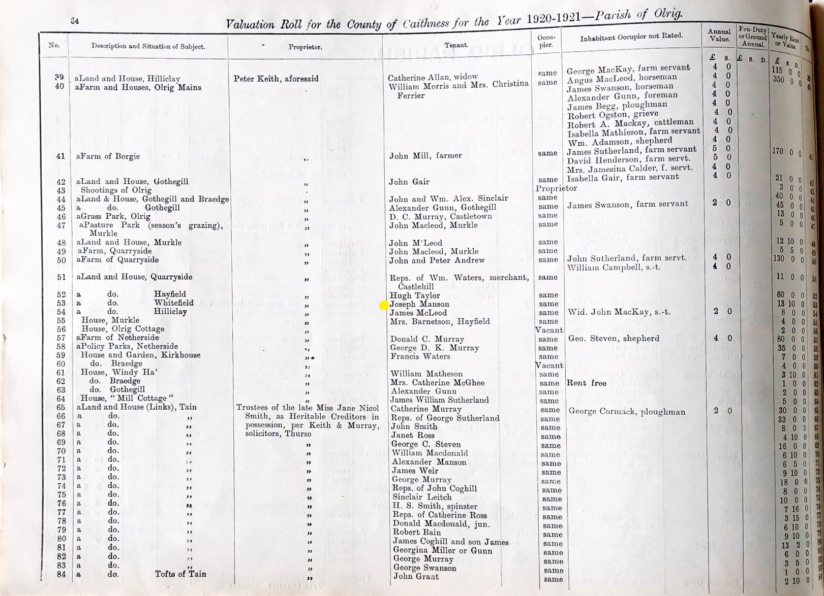 The family of seven arrived at the croft in 1917 and the valuation rolls for Olrig Parish 1917-1918 and 1920-21, reproduced below, show her father Joseph Manson as Tenant at Whitefield. His name has been marked with a yellow dot. His landlord was the proprietor and solicitor Peter Keith of Thurso. Note the increase in rent from £10 8s to £13 10s.