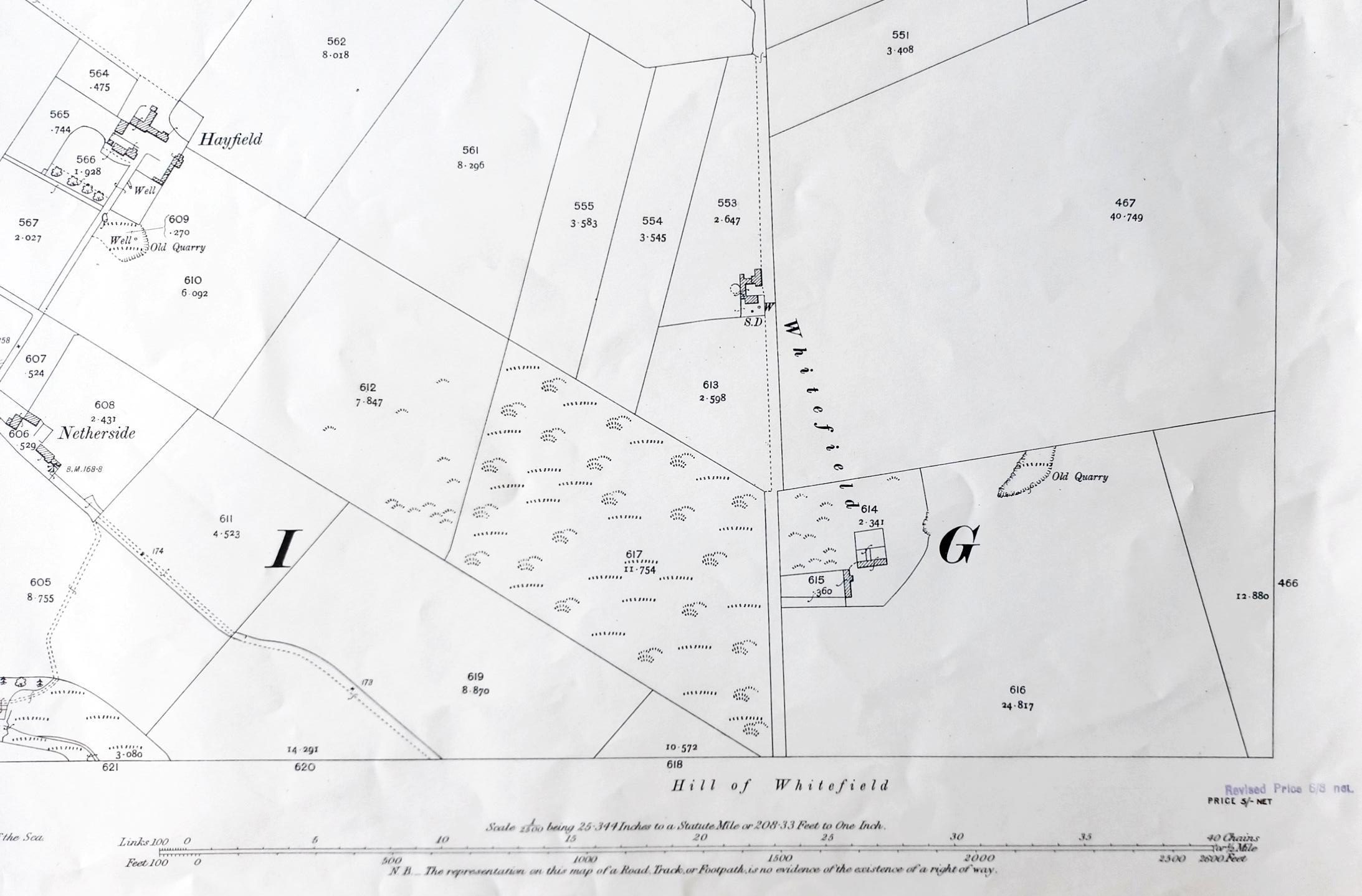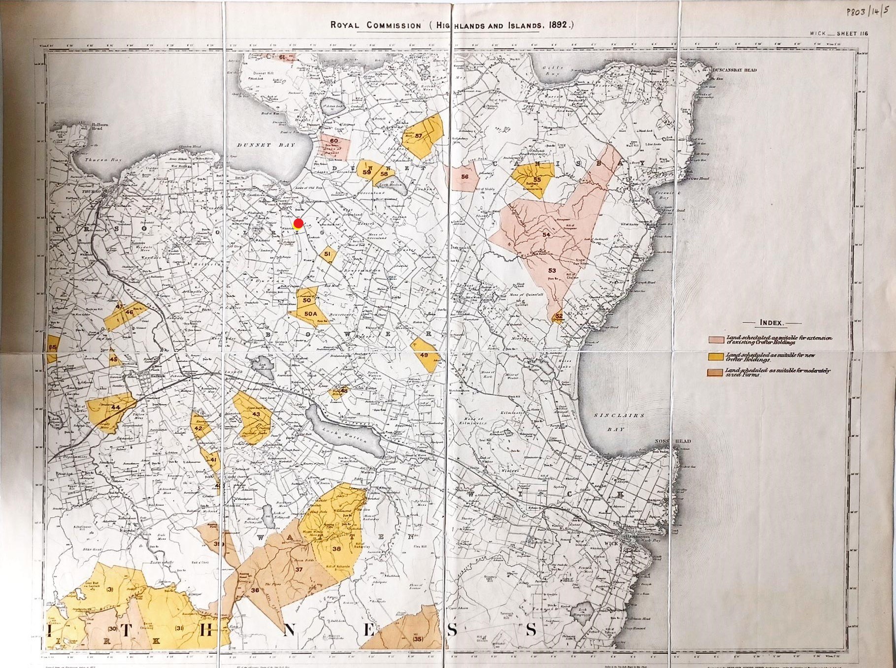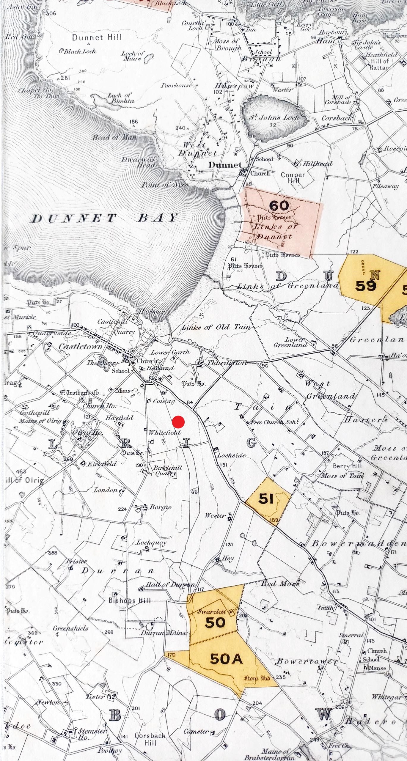 The area of Whitefield is just to the south of Castletown at the turn for Tansfield. Both the Ordinance Survey Map and Royal Commission maps of crofter holdings showing Whitefield are reproduced below. It has been marked with a yellow or red dot.