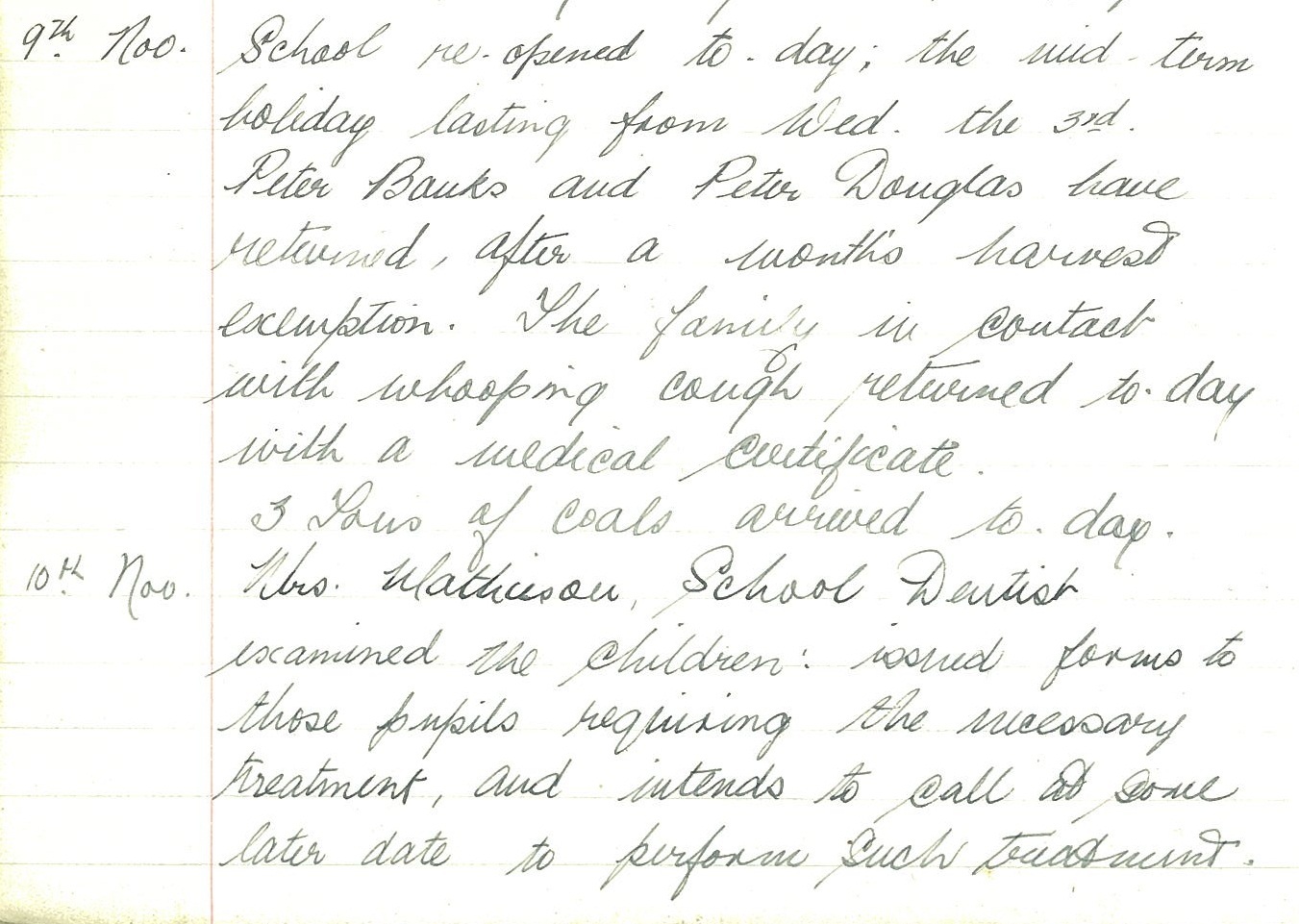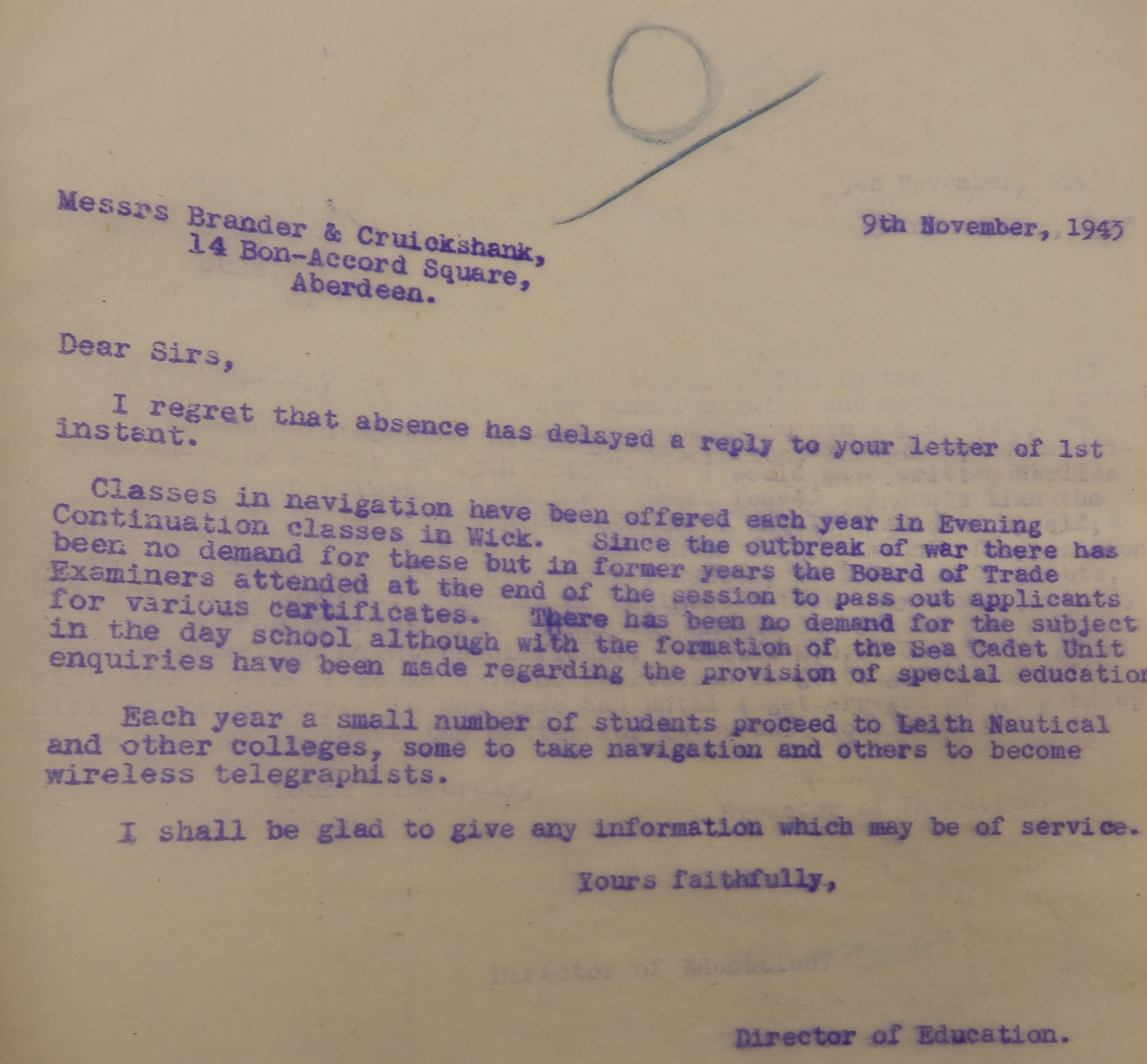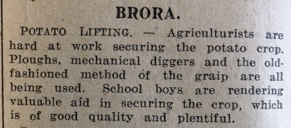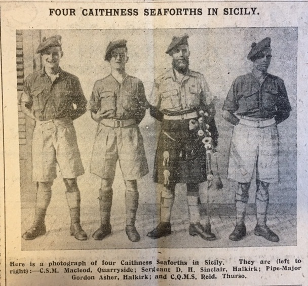 The focus of farmers in the north Highlands had switched from bringing in the harvest to potato lifting. The John O’Groat Journal reported that in Brora, “Agriculturists are hard at work securing the potato crop. Ploughs, mechanical diggers and the old-fashioned method of the graip [a long-handled fork] are all being used. School boys are rendering valuable aid in securing the crop, which is of good quality and plentiful.” The head teacher of Canisbay School noted on 9 November that the mid-term holiday had marked the end of the harvest, and that the recent outbreak of sickness had run its course: “Peter Banks and Peter Douglas have returned after a month’s harvest exemption. The family in contact with whooping cough returned today with a medical certificate.” Next day, “Mrs Mathieson, School dentist, examined the children” to see who would require treatment; ominously the log book states that she would “call at some later date to perform such treatment”. Bower School, on the other hand, had a visit from the School Medical Officer, who “expressed herself well satisfied with their general cleanliness, but found two pupils showing traces of itch.” The Director of Education replied to a correspondent on 9 November on the subject of adult education classes in navigation, observing that “since the outbreak of war there has been no demand for these… There has been no demand for the subject in the day school but since the formation of the Sea Cadet Unit enquiries have been made. Each year a small number of students proceed to Leith Nautical and other colleges, some to take navigation and others to become wireless telegraphists.”Finally this week, the John O’Groat Journal printed a photograph of four Caithness Seaforths in the recent Sicily Campaign. They were C.S.M. Macleod, Quarryside; Sergeant D.H. Sinclair, Halkirk; Pipe-Major Gordon Asher, Halkirk; and C.Q.M.S. Reid, Thurso.