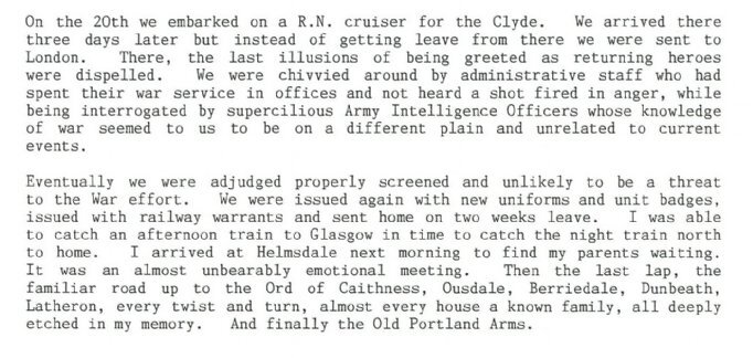 “Eventually we were adjudged properly screened and unlikely to be a threat to the War effort. We were issued again with new uniforms and unit badges, issued with railway warrants and sent home on two weeks leave. I was