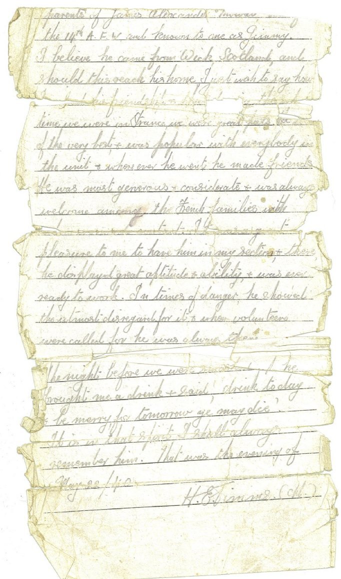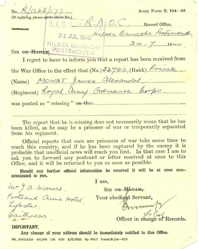 In January 1940 his unit was posted to northern France, but in the confusion of fighting when Germany invaded in May, and the retreat which led to the evacuation at Dunkirk, all trace of him was lost. In early June his father sent a letter hoping to reach him but the letter was sent back marked “addressee posted missing”.A month later the family received official notification that James had been posted as missing, but that this “does not necessarily mean that he has been killed”.