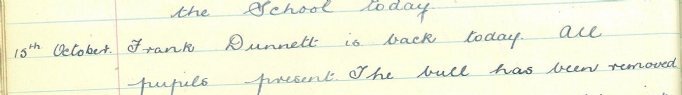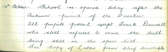 But on the next day, a short note in the school log book shows that the saga had finally come to an end: “15th October. Frank Dunnett is back today. All pupils present. The bull has been removed.”