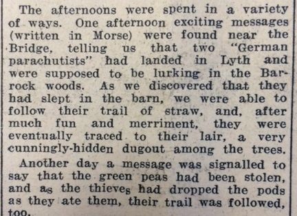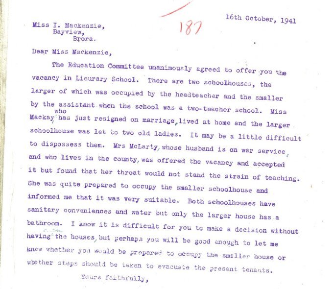 The Director of Education wrote to a Miss Mackenzie of Brora this week to offer her the post of teacher at Lieurary School. There was a slight complication, however: only the larger schoolhouse had a bathroom, and it “… was let to two old ladies. It may be difficult to dispossess them… I know it is difficult for you to make a decision without having seen the houses, but perhaps you will be good enough to let me know whether you would be prepared to occupy the smaller house or whether steps should be taken to evacuate the present tenants.”The St Fergus Girl Guides had spent a week at Swartybank, Lyth. The John O’Groat Journal included a report by them of their activities: “One afternoon, exciting messages (written in Morse) were found near the Bridge, telling us that two “German parachutists” had landed in Lyth and were supposed to be lurking in the Barrock woods. As we discovered that they had slept in the barn, we were able to follow their trail of straw, and, after much fun and merriment, they were eventually traced to their lair, a very cunningly-hidden dugout among the trees.”